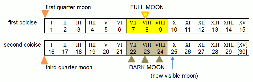 플리니우스에 따르면, 켈트족의 달은 '초승달의 6일째'에 시작한다고 하는데, 이는 상현달을 의미하며 콜리니력의 시작일과 일치한다.