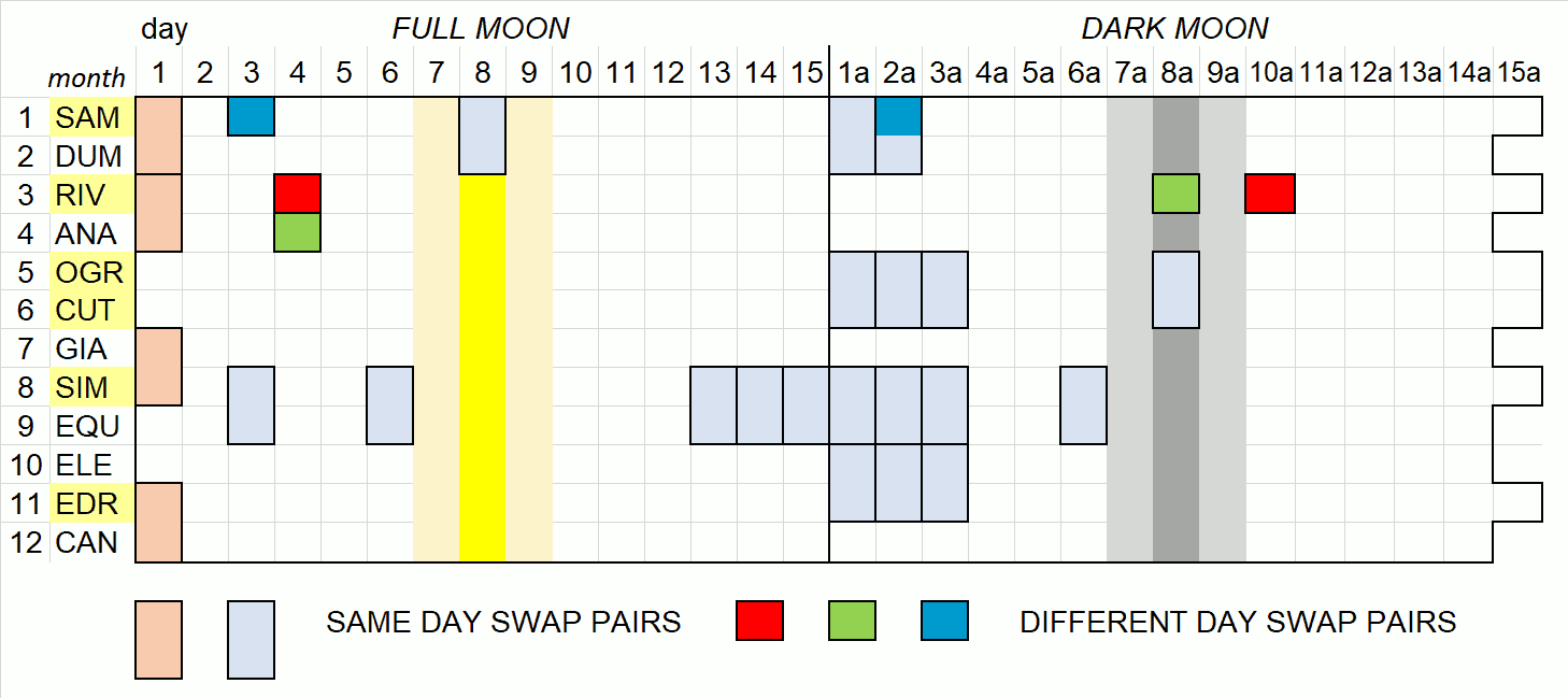 각 음력에는 12개의 음력이 있으며, 30일인 달이 6개월, 29일인 달이 5개월이지만 29/30 쌍이 아니며, 29일 또는 30일인 가변적인 달이 1개 있다. 삭망월은 29.53일이므로, 달력은 MID EQVOS의 달이 달의 위상에 맞춰 달력을 유지하기 위해 필요한 29일 또는 30일을 갖도록 하여 약간의 미끄러짐이나 일시적인 불균형을 극복한다.