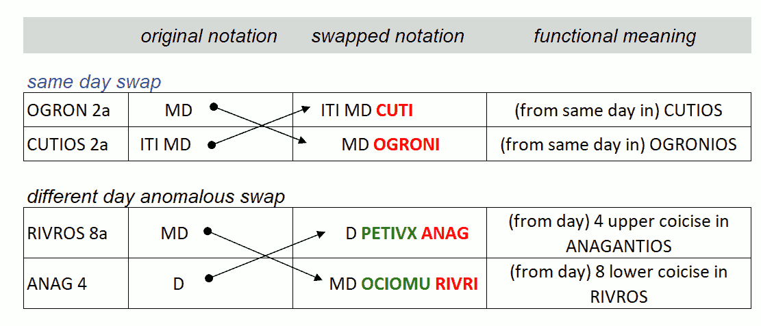 표기가 다른 날짜로 이동할 때, 원래 위치에 대한 정보도 함께 이동한다. 이는 날짜 교환을 예측하는 데 사용될 수 있다. 대부분의 이동은 같은 달의 날짜로 이동하므로 날짜 정보는 중복되기에 달 이름(속격)만 추가된다. 그러나 다른 날짜 간의 변칙 교환에서는 원래 날짜 이름과 달 이름을 모두 추가해야 한다.