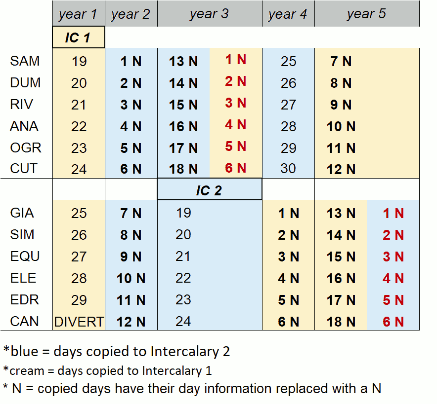 5년 주기의 첫 해에는 평12월과 평1월 사이에 30일인 윤달 Quimoniosxtg가 추가된다. 5년 주기의 셋째 해에는 평6월과 평7월 사이에 30일인 윤달 Sonnocingosxtg("태양의 행진")[14]가 추가된다.