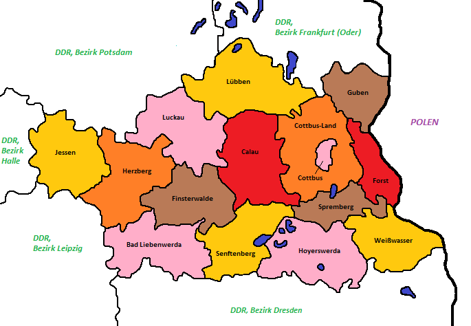 - '''농촌 행정 구역:''' 바트리벤베르다 군(Kreis Bad Liebenwerdadeu), 칼라우 군(Kreis Calaudeu), 콧부스란트 군(Kreis Cottbus-Landdeu), 핀스터발데 군(Kreis Finsterwaldedeu), 포르스트 군(Kreis Forstdeu), 구벤 군(Kreis Gubendeu), 헤르츠베르크 군(Kreis Herzbergdeu), 호이에르스베르다 군(Kreis Hoyerswerdadeu), 예센 군(Kreis Jessendeu), 루카우 군(Kreis Luckaudeu), 뤼벤 군(Kreis Lübbendeu), 젠프텐베르크 군(Kreis Senftenbergdeu), 슈프렘베르크 군(Kreis Sprembergdeu), 바이스바서 군(Kreis Weißwasserdeu)