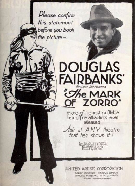 쾌걸 조로 (1920년 영화)는 19세기 초 스페인령 캘리포니아를 배경으로, 부유한 목장주 돈 알레한드로 베가의 아들 돈 디에고 베가가 악당 세뇨르 조로로 변장하여 부패한 알바라도 총독과 그의 부하들로부터 평범한 시민들을 보호하는 이야기를 다룬 영화이다. 더글러스 페어뱅스가 돈 디에고 베가/조로 역을 맡았으며, 롤리타 풀리도 역은 마거릿 드 라 모트가 연기했다. 이 영화는 1919년 존스턴 매컬리의 소설 『카피스트라노의 저주』를 영화화한 작품으로, 2008년 제프리 밴스는 이 영화가 더글러스 페어뱅스의 경력과 액션 어드벤처 영화 발전에 획기적인 작품이라고 평가했다. 2012년에는 아카데미 영화 보관소에 의해 보존되었다.