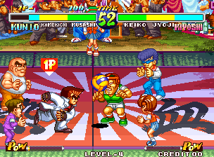 쿠니오 | 호리카와 료 | 열혈 고교의 터프가이. 올라운드 타입이다. | 열혈 너트 슛[1] (공중 사용 가능) | 열혈 롤링 크래시[1] (공중 사용 가능) | 열혈 로열 스트라이크[1] |