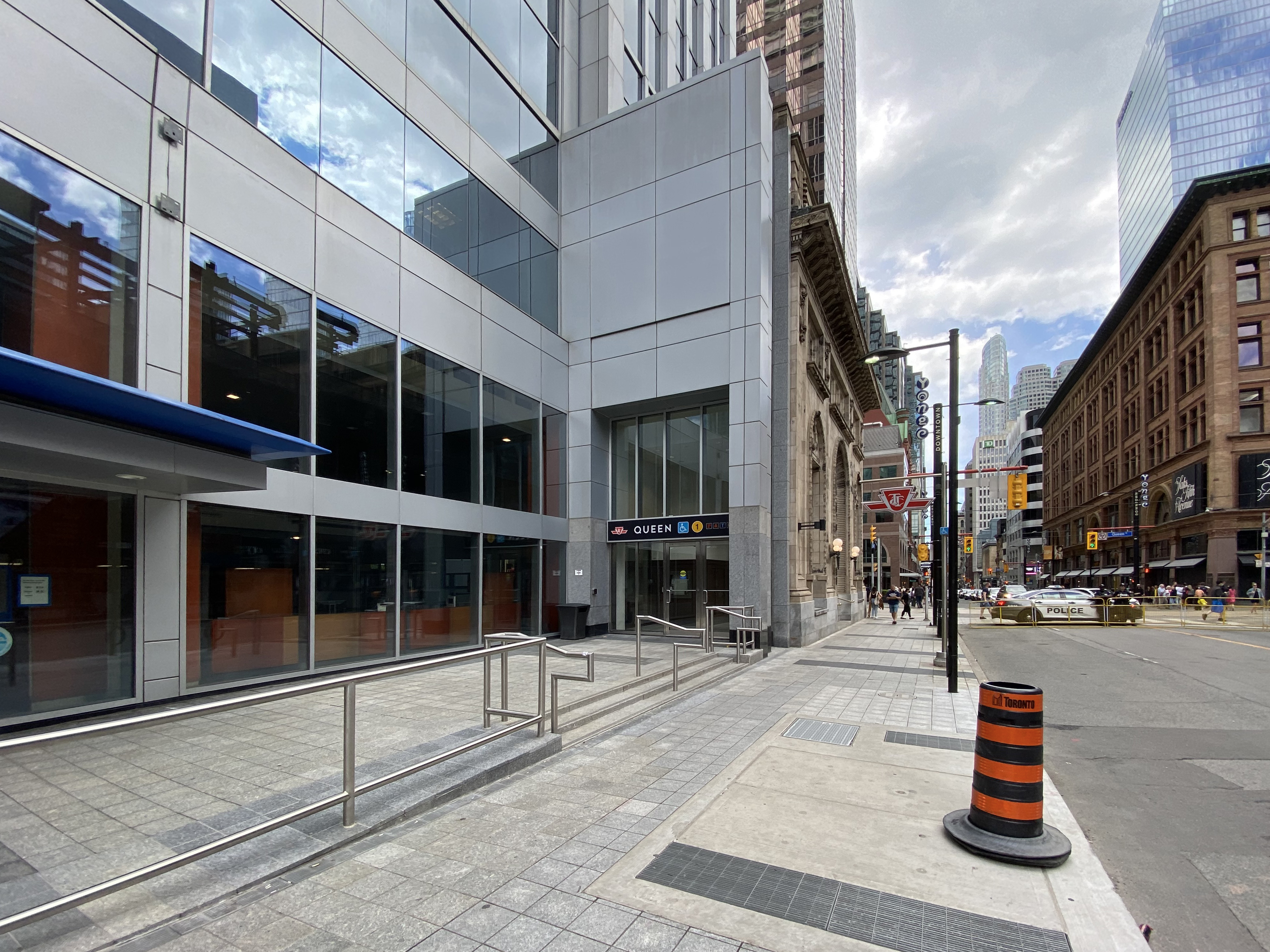 퀸 역은 영 스트리트를 따라 퀸 스트리트 북쪽에서 슈터 스트리트까지 위치해있다. 이 역은 총 7개의 출입구를 가지고 있으며, 이턴 센터와 매리타임 라이프 타워를 통해 휠체어 승객들이 이용할 수 있다. 나머지 출입구는 슈터 스트리트, 퀸 스트리트 이스트 1번지, 퀸 스트리트 웨스트 8번지, 허드슨 베이, 이튼 센터 바깥 북쪽 출입구 계단을 통해 접근할 수 있다.