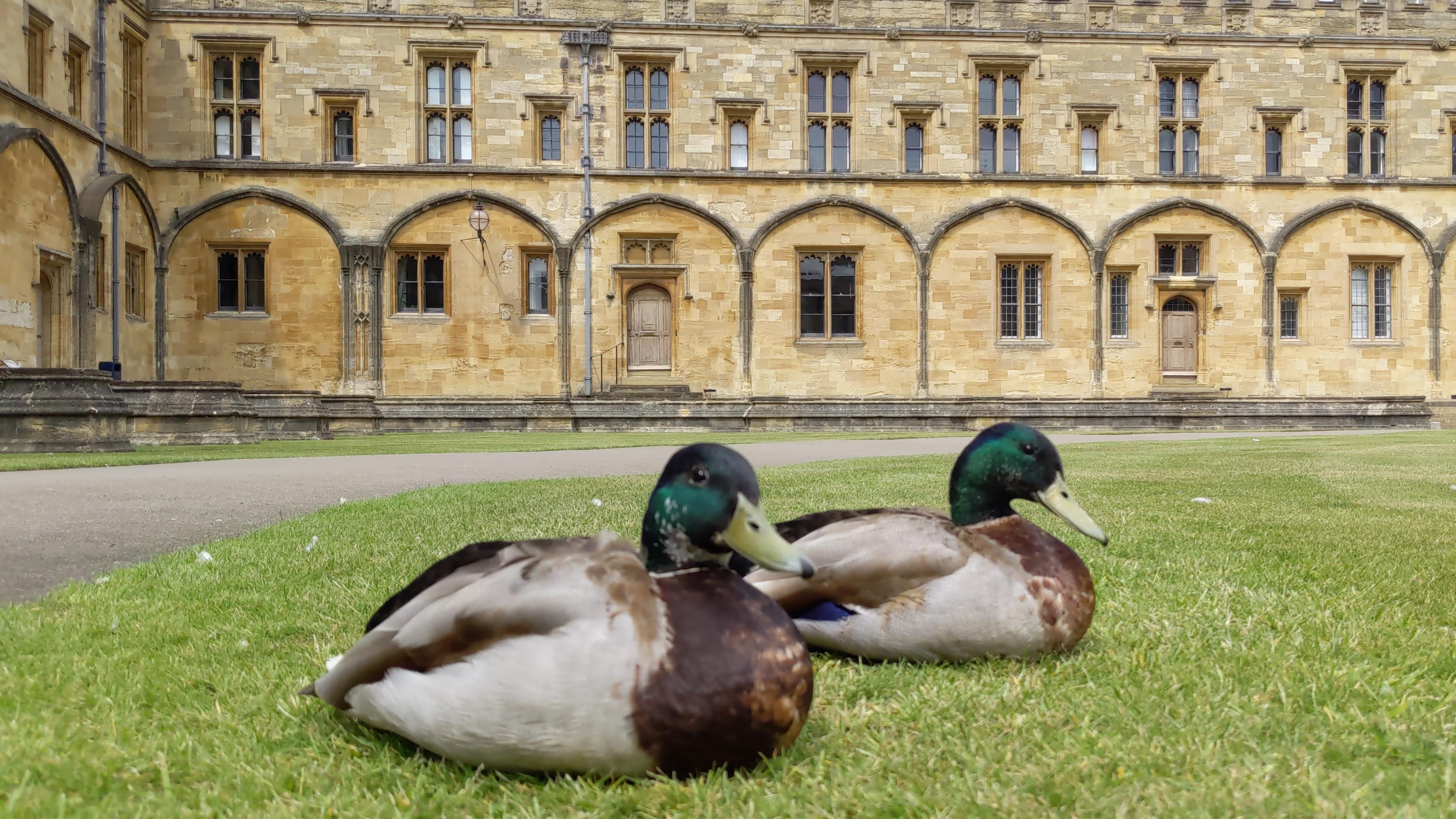 Tom and Peck, the Christ Church ducks are back! Maybe we'll soon see some ducklings waddling around Tom Quad?? 🦆🦆 Thanks to @LucyATaylor for the up-close-and-personal photo. #ChristChurchTogether #TomTower9o5 #ChChimes #ducks https://t.co/BpPyd6UwQt