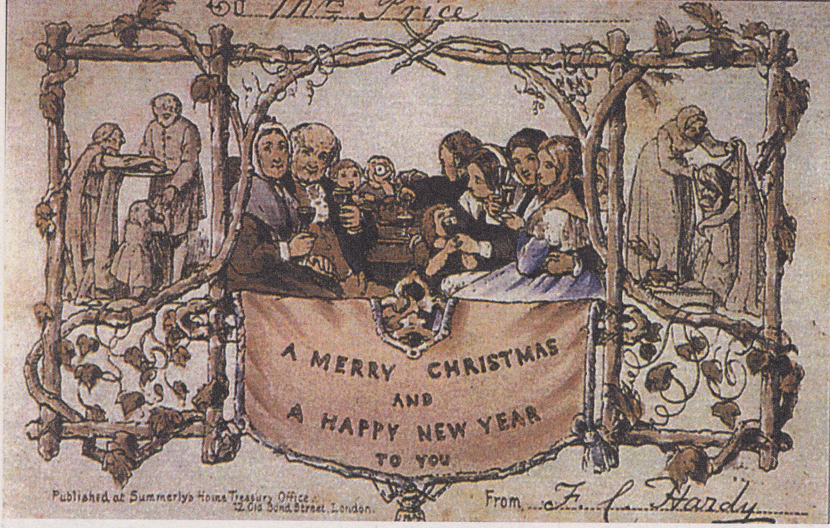 세계 최초의 상업용 크리스마스 카드는 1843년 런던에서 헨리 콜(Henry Cole) 경이 기획하고 존 캘콧 호슬리(John Callcott Horsley)가 디자인했다.[3][4][5] 카드 중앙에는 세 세대의 가족이 카드 수신자에게 건배하는 모습이 그려졌고, 양쪽에는 가난한 사람들에게 음식과 옷을 나눠주는 자선 활동 장면이 담겼다.[6] 가족이 함께 술을 마시는 그림 때문에 논란이 일기도 했지만, 3년 전 페니 우편(Penny Post) 제도를 도입하는 데 기여했던 콜의 아이디어는 시기적절했다. 총 2,050장의 카드가 인쇄되어 그 해 장당 1실링(shilling)에 판매되었다.[7]