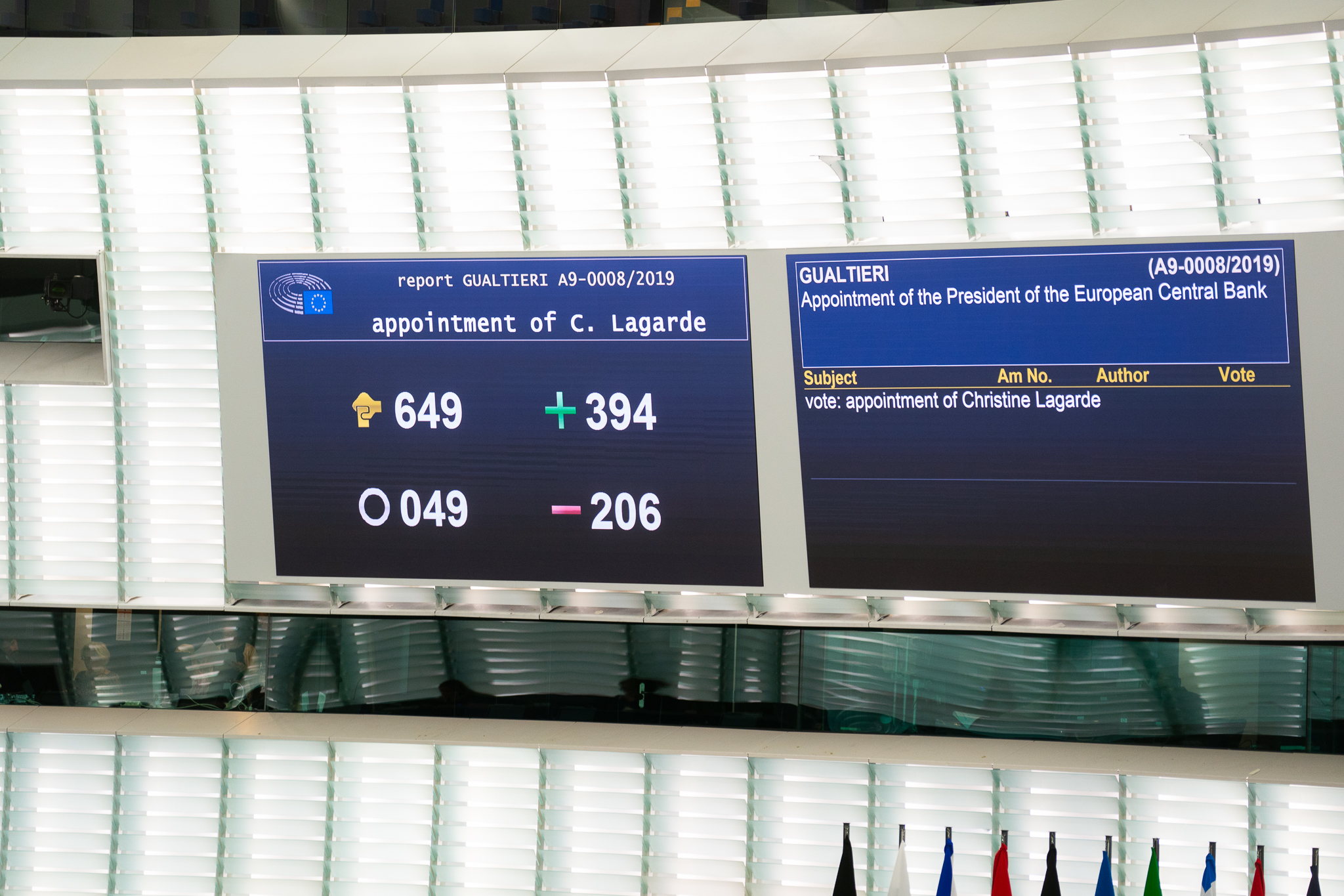 크리스틴 라가르드는 2019년 7월 2일 유럽 이사회로부터 유럽 중앙은행(ECB) 총재로 내정되었으며, 2019년 11월 1일에 마리오 드라기의 뒤를 이어 취임하였다.[167] 같은 해 9월 17일 유럽 의회는 비밀 투표를 통해 찬성 394표, 반대 206표, 기권 49표로 라가르드의 총재 임명을 가결하여,[168] 유럽 중앙은행 최초의 여성 총재가 되었다.[168]
