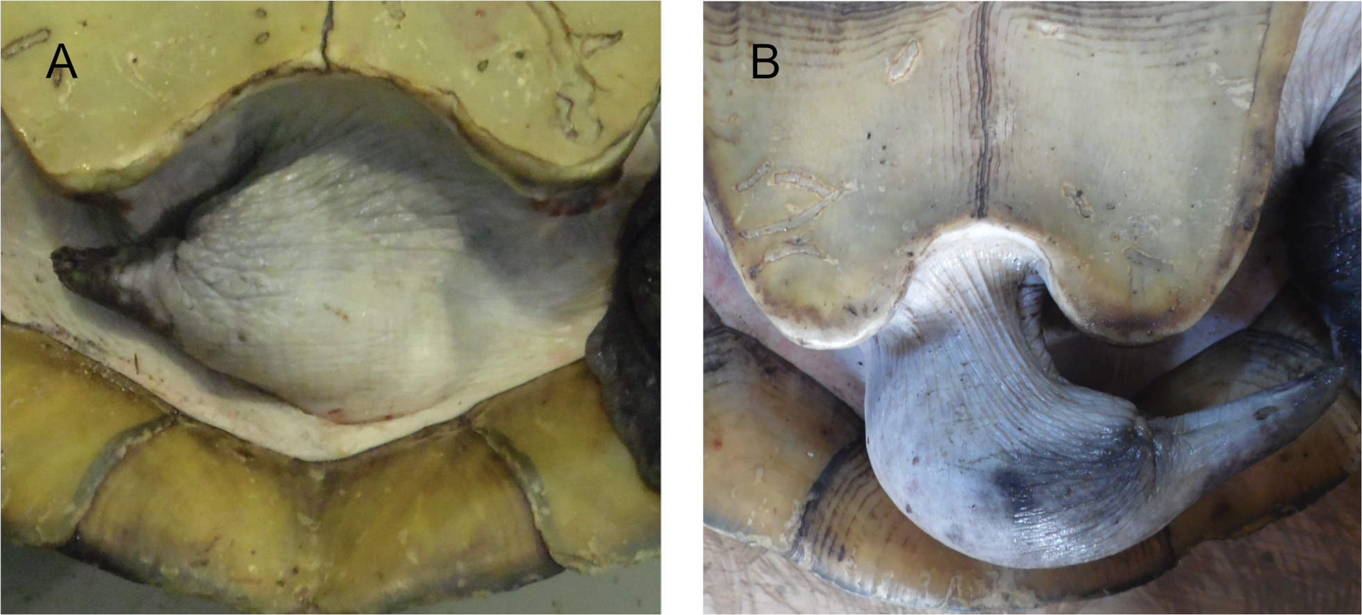 수컷은 암컷에 비해 등갑의 폭이 좁고 갑고가 낮다. 수컷 성체는 꼬리가 굵고 길며, 꼬리를 똑바로 폈을 때 총배설강 전체가 등갑 바깥쪽에 위치한다.[17] 반면 암컷 성체는 꼬리가 가늘고 짧으며, 꼬리를 똑바로 펴도 총배설강의 전체나 대부분이 등갑 안쪽에 있다.[17]