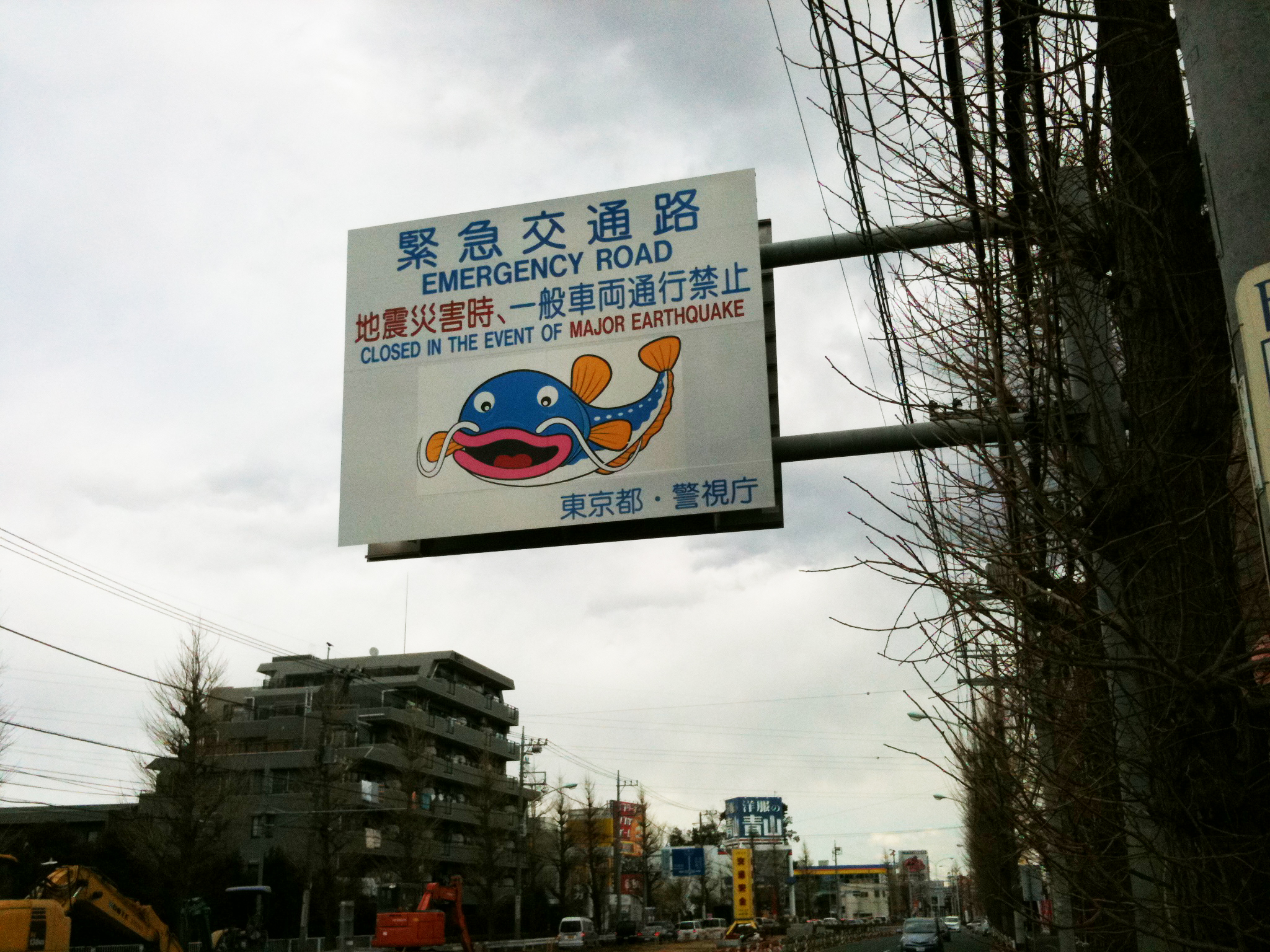 - 일본 기상청의 (EEW) 로고와 지진 조기 경보 모바일 애플리케이션 유레쿠루 콜은 메기 그림을 아이콘으로 사용한다.