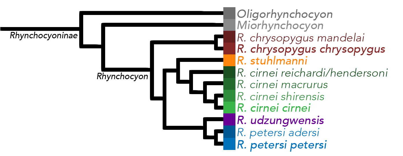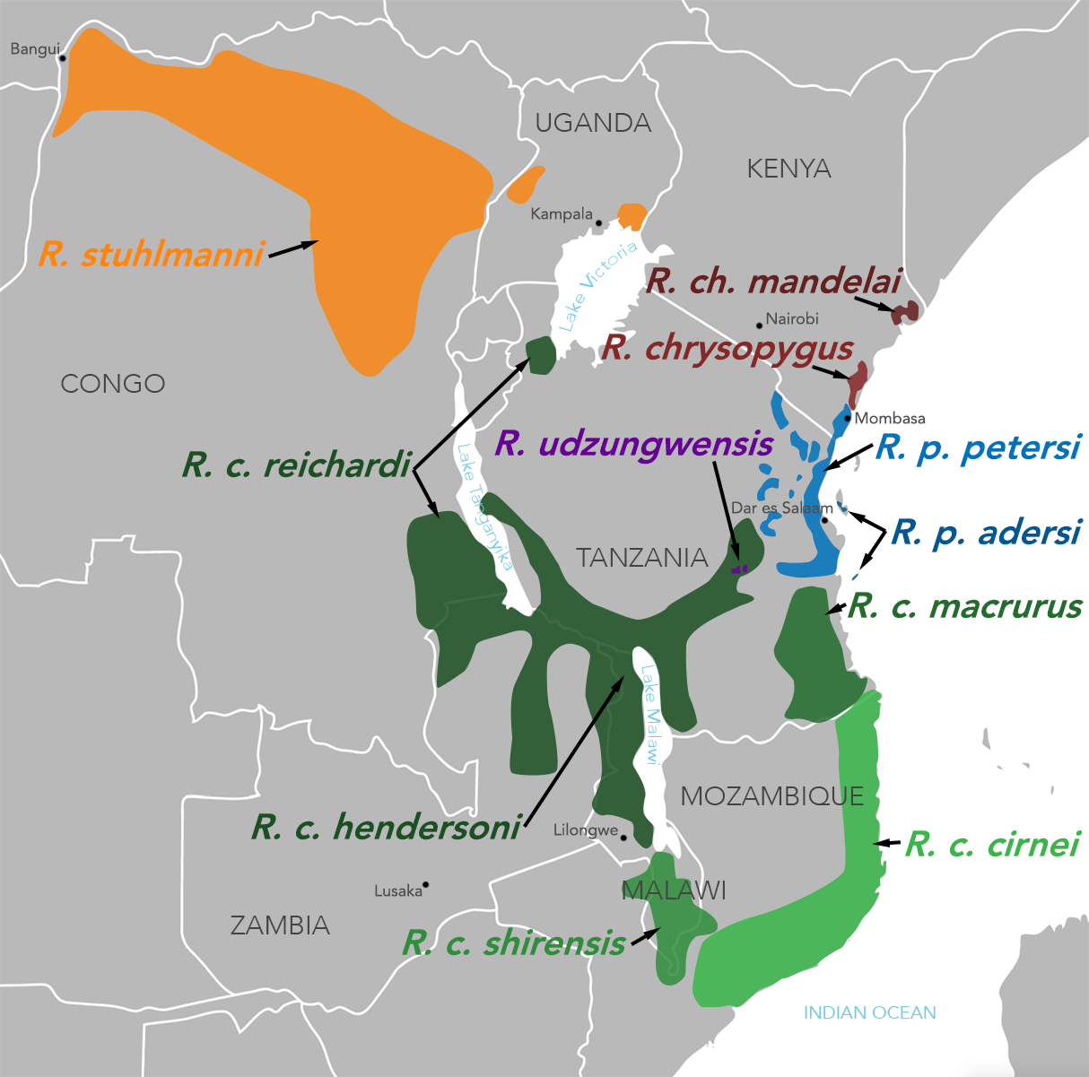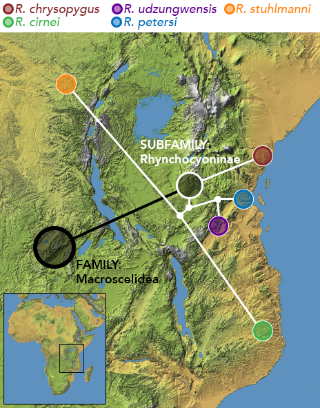 ''R. chrysopygus'', ''R. cirnei'', 그리고 ''R. petersi''는 이소성 분포를 보이며, 최근에 발견된 ''R. udzungwensis''와 아종 ''R. cirnei reichardi''는 근접종 분포를 보인다. mtDNA에 의해 감지된 바와 같이, ''R. udzungwensis''와 ''R. cirnei reichardi'' 사이에서 약간의 유전자 침투 (잡종 형성)가 일어났다. ''R. p. adersi''는 희귀하며 분포가 독특하여 잔지바르 제도의 섬에서 고립되어 발견된다. ''R. c. reichardi''는 일반적으로 탄자니아, 잠비아, 말라위의 열곡지대 고원에서 발견되며, ''R. c. hendersoni''는 말라위 북부의 고원에서 발견된다.
