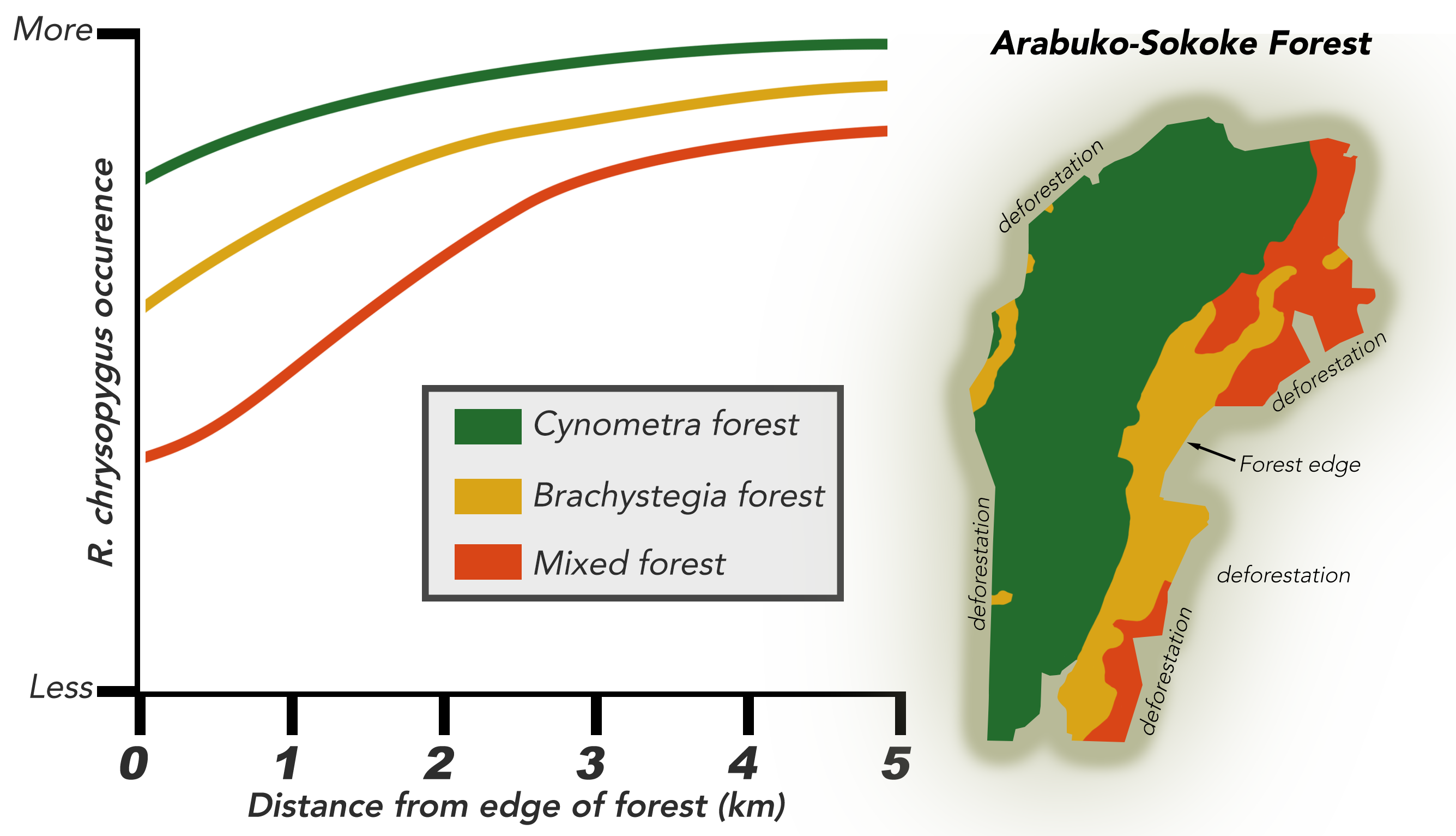 ''R. chrysopygus''는 원래 몸바사에서 타나 강까지 이어지는 중단 없는 해안 숲에 서식했지만, 80%가 산림 벌채되었으며, 아라부코-소코케 숲만이 가장 큰 부분으로 남아 있다.[7] ''R. chrysopygus''는 약 328 km2를 사용하며, 숲 가장자리에 가까워질수록 존재와 활동이 감소한다.[7] 이 숲에는 ''Cynometra'' 덤불, ''Brachystegia'' 숲, 혼합 숲(Afzelia quanzensisla, 심하게 벌목된 나무 종[34]이 지배적)과 같은 다양한 유형의 서식지가 존재한다.[7] ''R. chrysopygus''는 ''Cynometra'' 숲과 ''A. quanzensis''가 풍부하게 유지된 혼합 숲을 선호한다.[7]