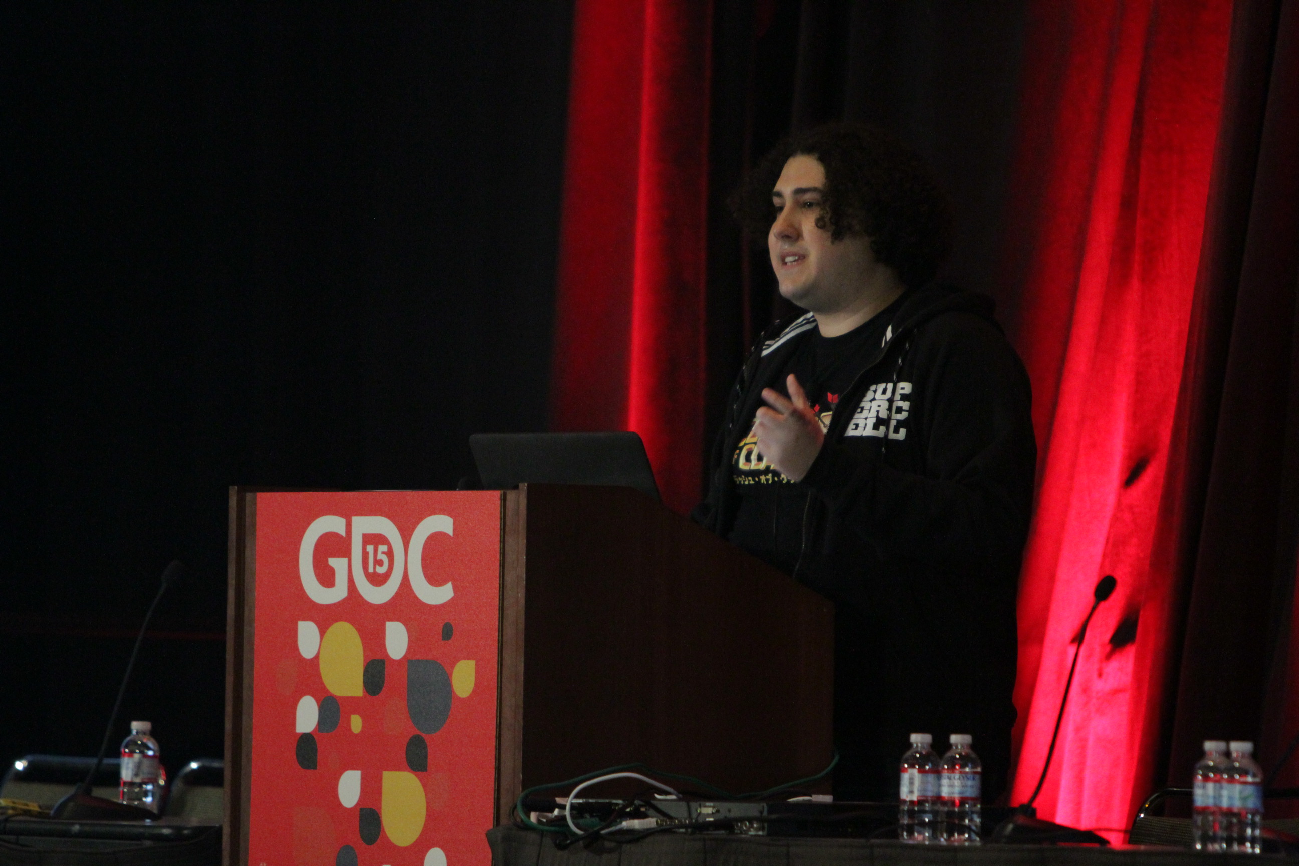 《클래시 오브 클랜》의 프로그래머 중 한 명인 요나스 콜라로스(Jonas Collaros)가 2015년 GDC에서 게임 디자인에 대해 이야기하고 있다.