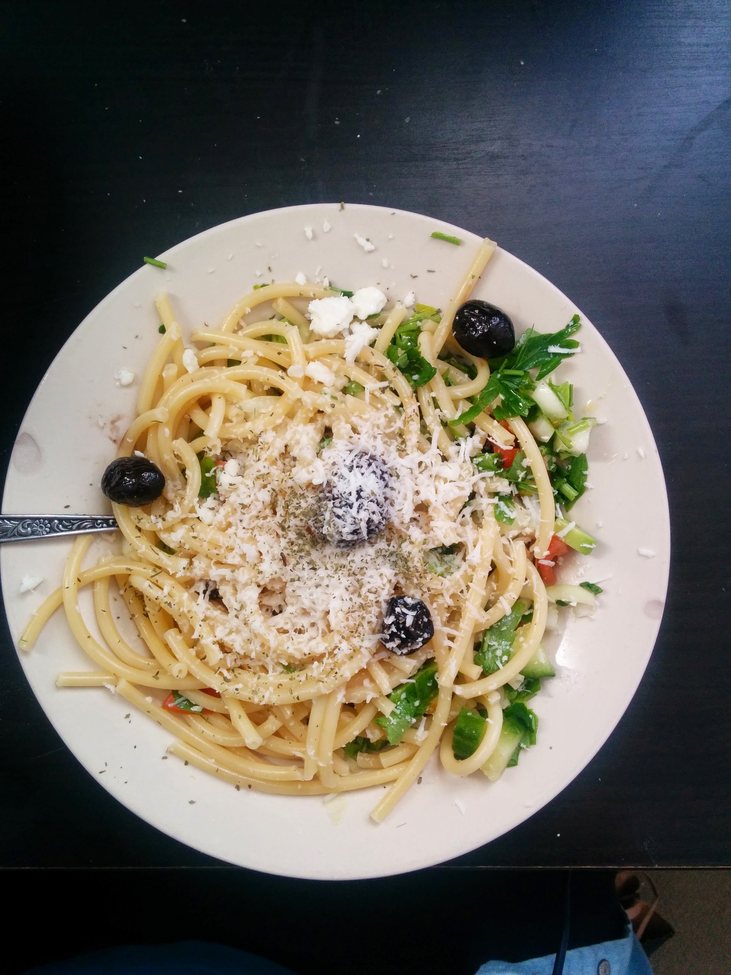 샐러드와 올리브를 곁들인 ''Magarina bulli''