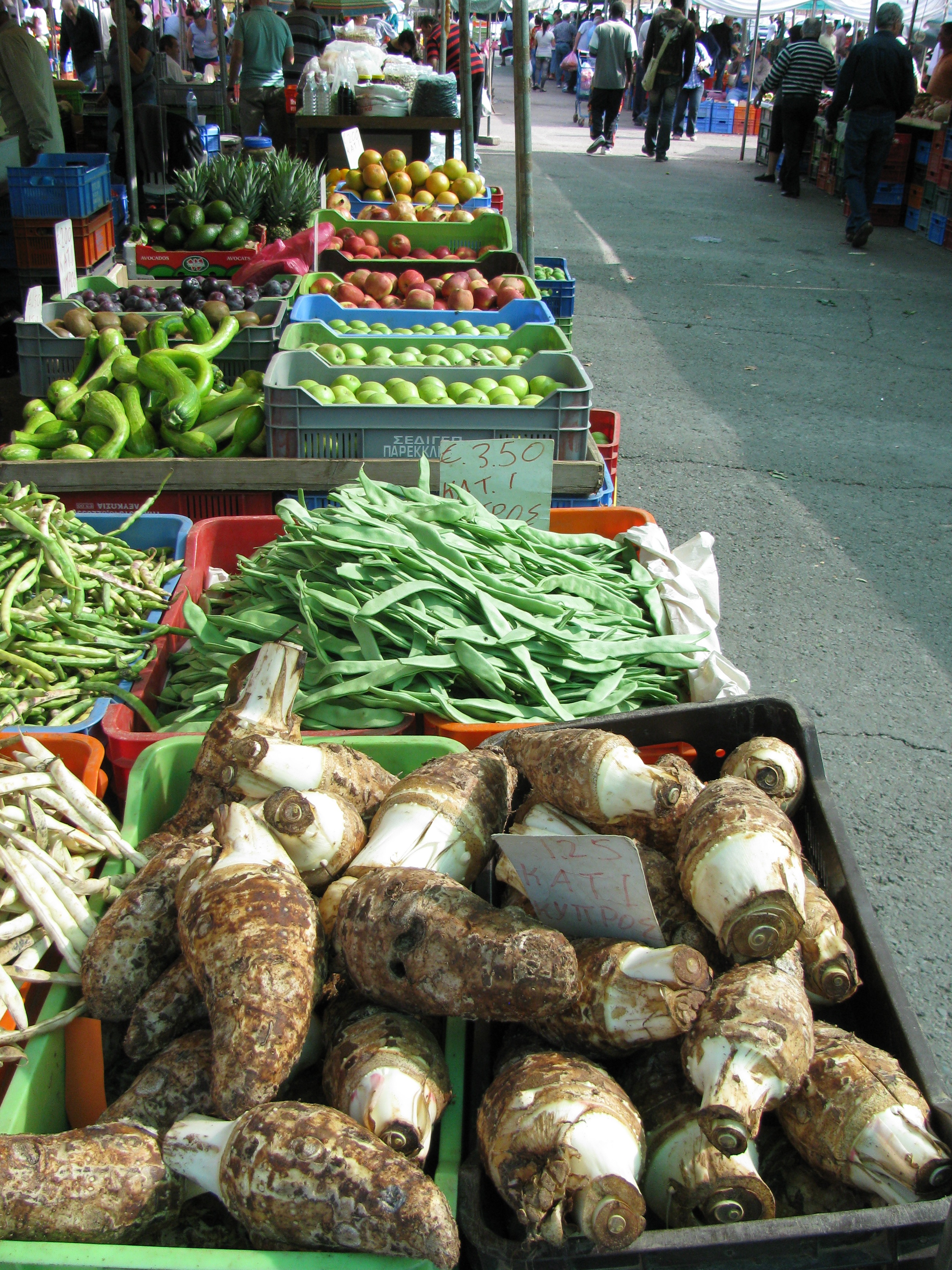 니코시아의 수요일 채소 시장; 전경의 뿌리 채소는 ''kolokasi''이다.