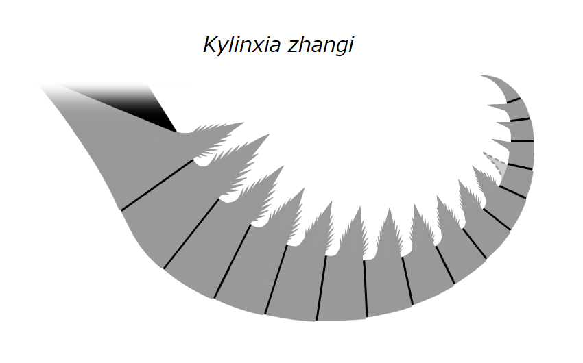 - 꼬리 부분과 꼬리 부채: 뒤쪽 여러 체절이 융합되어 있고, 몸통과 거의 같은 모양의 부속지를 여러 쌍 가진 꼬리 부분은 삼엽충류(삼엽충) 등의 Artiopoda류에서 볼 수 있다. 중앙 1개와 좌우 2개의 구조체로 이루어진 꼬리 부채는 푸셴후이아류(첸장고카리스 등), Hymenocarina류(오다라이아 등), 메가케이라류(포르티포르켑스 등)에서 볼 수 있다. 킬린시아는 이러한 꼬리 부분과 꼬리 부채를 모두 갖춘 유일한 화석 절지동물이다.[15]