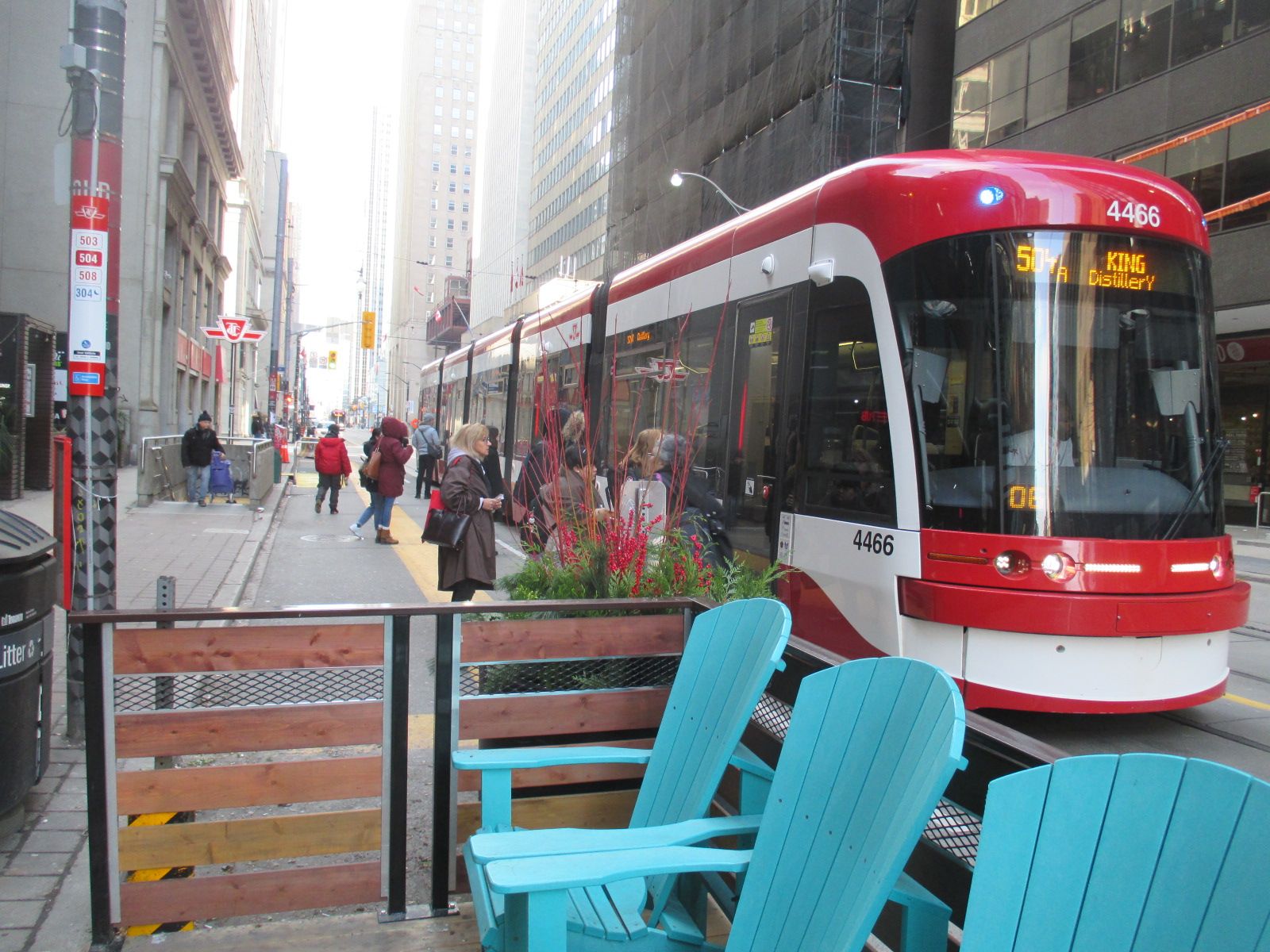 504A | 킹 | 노면 전차; 서쪽 방향으로 던다스 웨스트 역까지, 동쪽 방향으로 증류소 루프까지 |