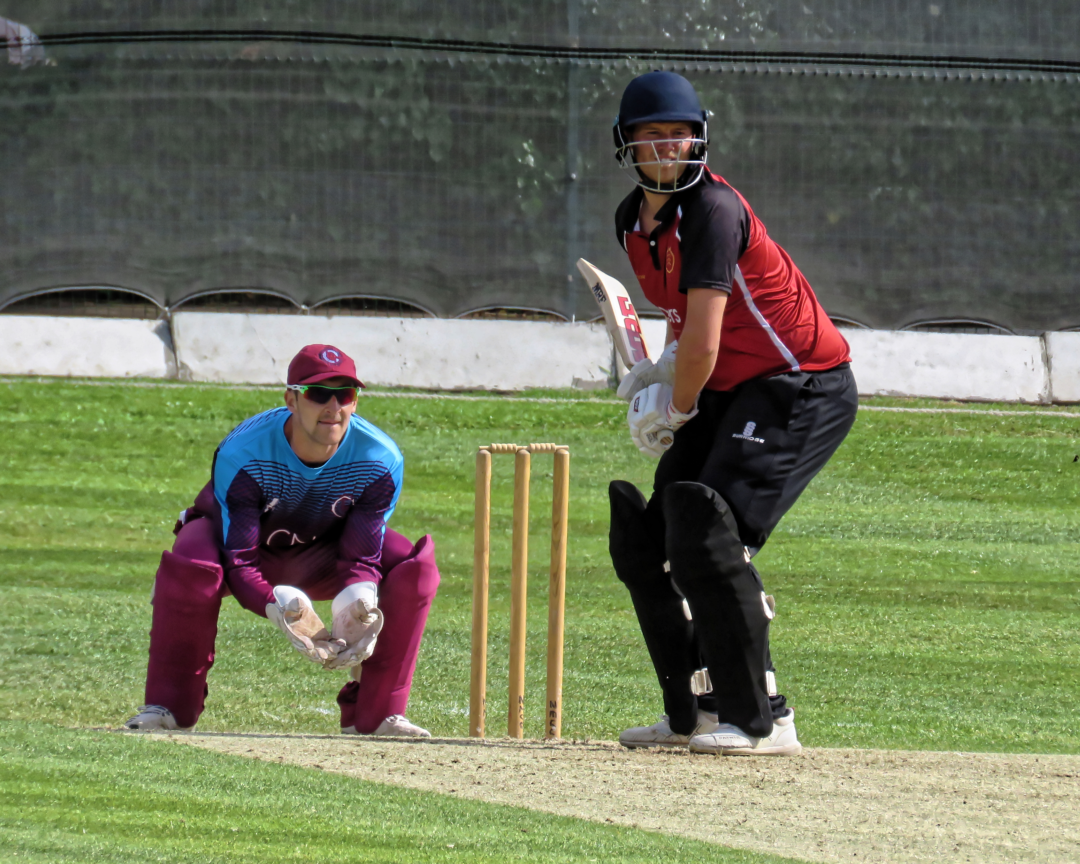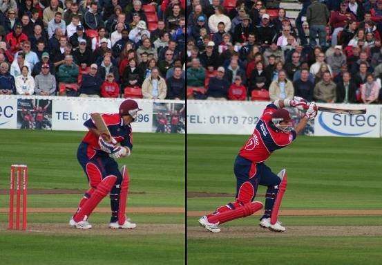 공이 타자(왼쪽)에게 도달하기 전에 배트는 높은 ''백리프트''로 잡혀 있으며, 앞으로 나아가 포워드 드라이브를 위해 스윙한다(오른쪽).