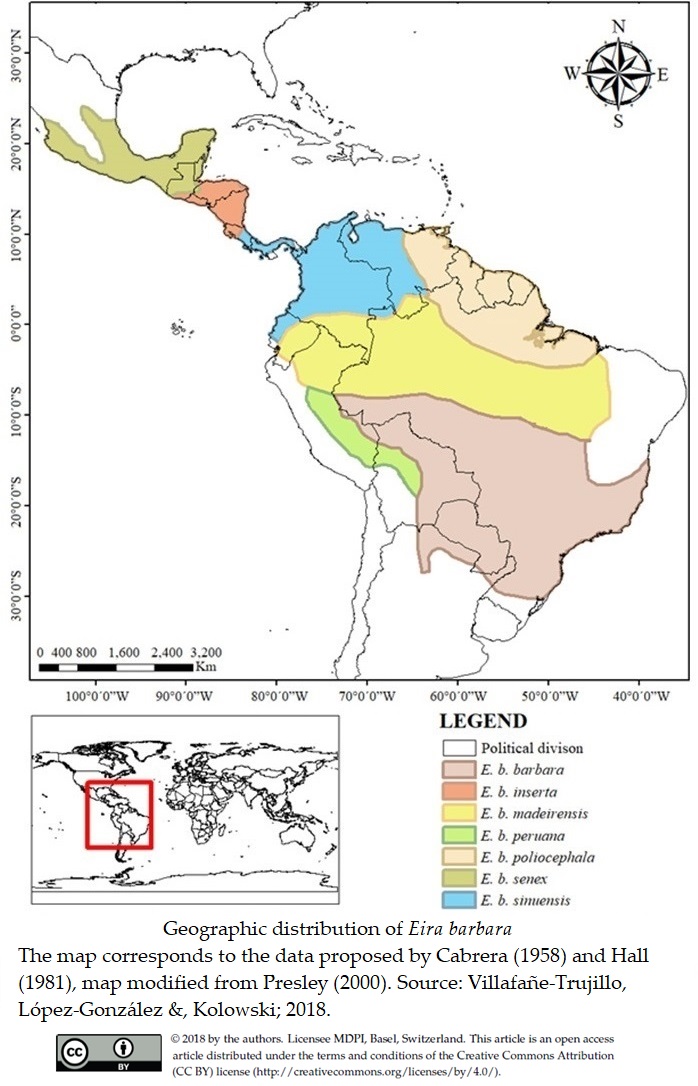 아종 분포 지역 E. b. barbara 아르헨티나 북부, 파라과이, 볼리비아 서부, 브라질 중부와 남부 E. b. inserta 과테말라부터 코스타리카 중부까지 E. b. madeirensis 에콰도르 서부, 브라질 북부 E. b. peruana 페루와 볼리비아의 동부 안데스 산맥 산기슭 E. b. poliocephala 베네수엘라 동부, 트리니다드, 가이아나, 수리남, 프랑스령 기아나, 브라질 북동부 E. b. senex 멕시코 중부부터 온두라스 북부까지 E. b. sinuensis 파나마, 콜롬비아, 베네수엘라 서부, 에콰도르 북부