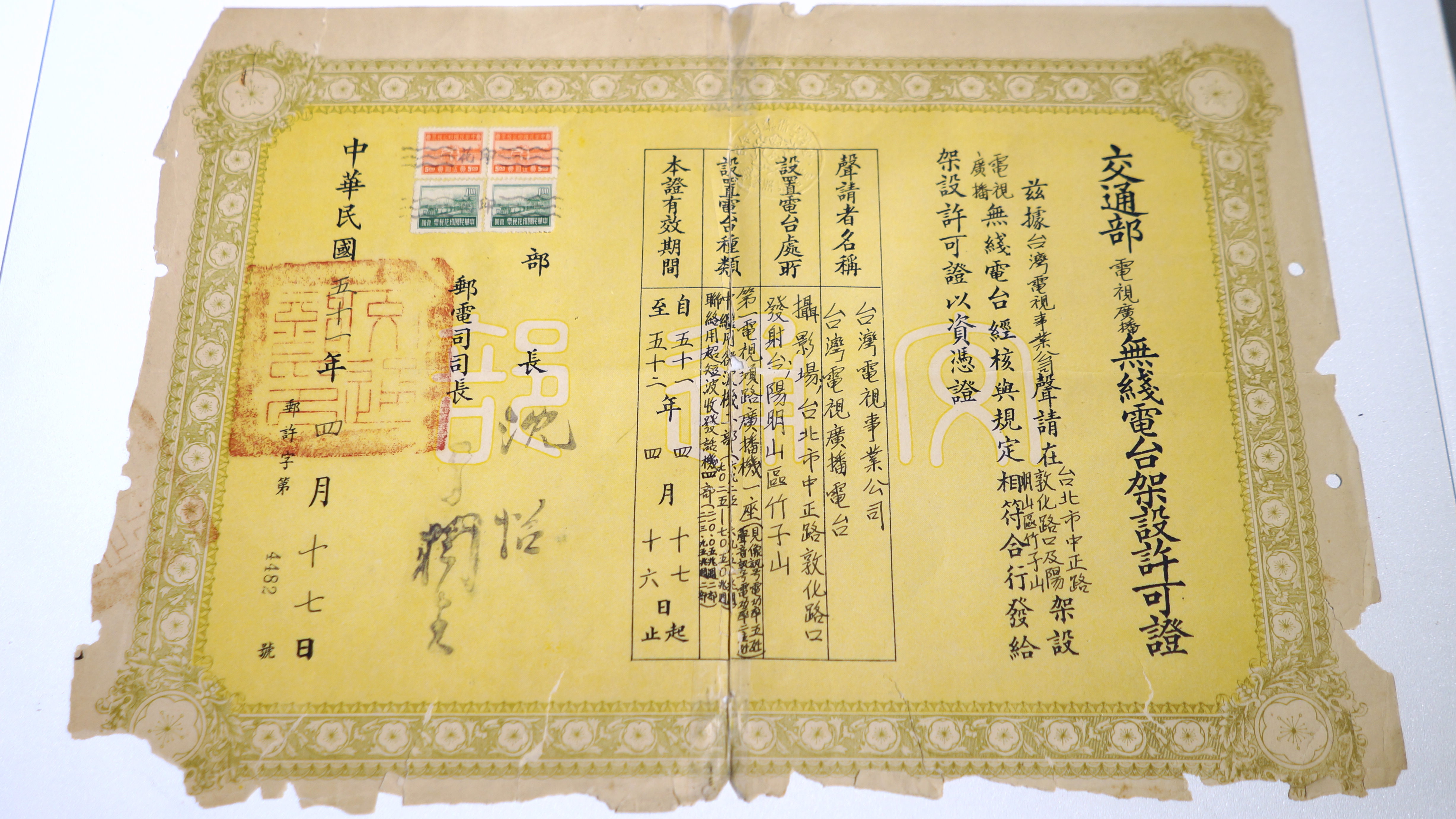 4월 17일, 중화민국 교통부는 TTV에 "교통부 텔레비전 및 라디오 방송국 설치 허가증"과 "우편허가번호 4482호"를 발급했다.