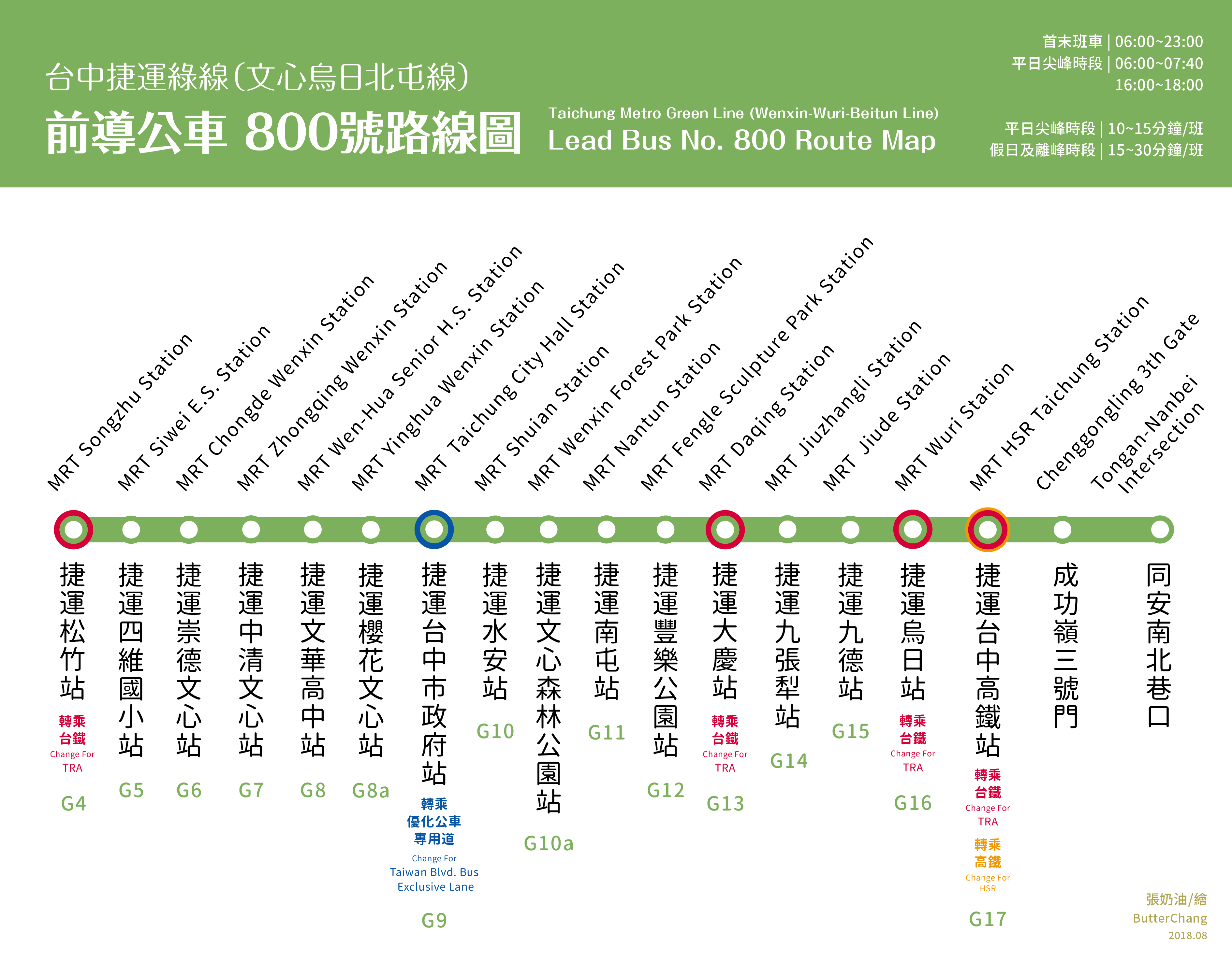 초기에는 역 번호가 G1부터 G20까지 순차적으로 매겨졌는데, 여기서 "G"는 녹색(Green)을 의미했다. 그러나 G8이 타이완어(Hokkien)로 비속어인 "치바이(chi-bai)"와 발음이 비슷하다는 이유로 "G" 접두사가 "1"로 변경되었다. 이는 녹색선이 완공된 첫 번째 노선이라는 것을 나타낸다.[23] 역의 영어 이름은 초기에는 통용병음(Tongyong Pinyin)과 한어병음(Hanyu Pinyin)이 혼용되어 표기되었는데, 표준화되지 않은 표기 방식에 대한 비판이 제기되었다.[24] 2020년 8월 24일 대중시 의회는 사휘초등학교역을 제외한 모든 역에 한어병음을 사용하기로 결정했다.[25]