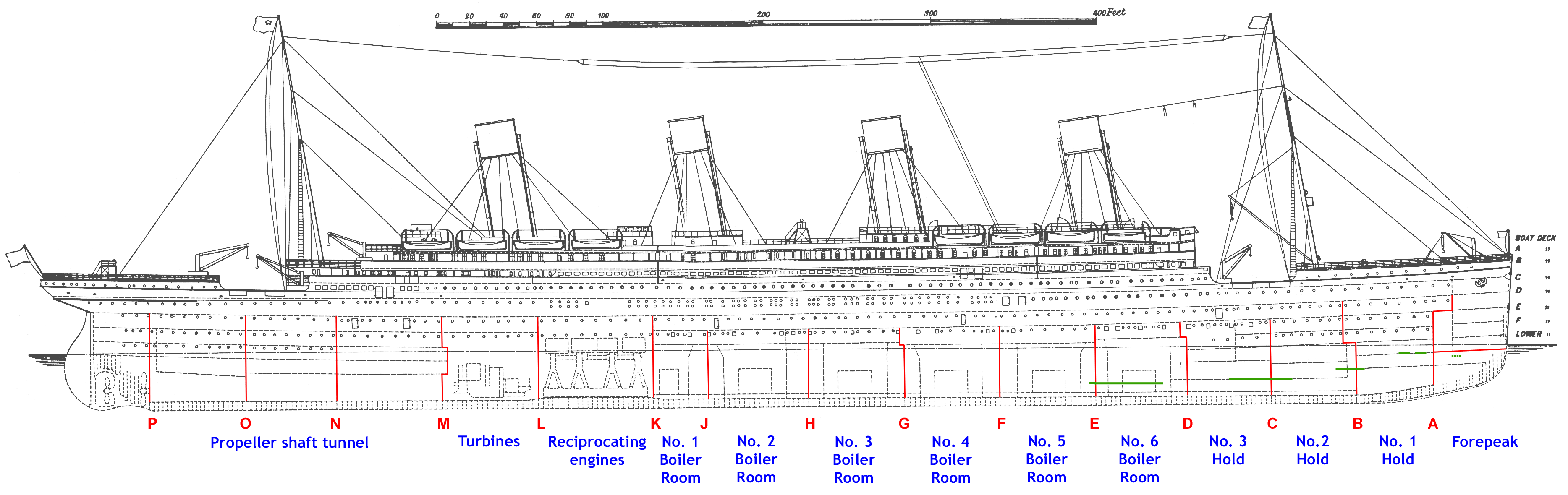 타이타닉호는 우현 측면이 빙산과 충돌하면서 수면 아래 약 90미터가 손상되었고, 뱃머리로부터 5개 구획에 걸쳐 엄청난 해수가 배 안으로 들어왔다. 타이타닉호의 격벽 구조는 2개 구획(뱃머리로부터는 4개 구획)까지 물이 들어오면 침몰하지 않고 버틸 수 있었으나, 5개 구획 이상에 물이 차면서 한계를 넘어섰다. 게다가 타이타닉의 격벽은 위의 E갑판과 연결되어 있는 구조라 선체가 부력을 잃고 앞으로 기울어지며 잠기는 와중에 해수는 격벽을 넘어 차례차례로 다른 구획까지 흘러 들어갔고 이는 배의 침몰을 가속했다.