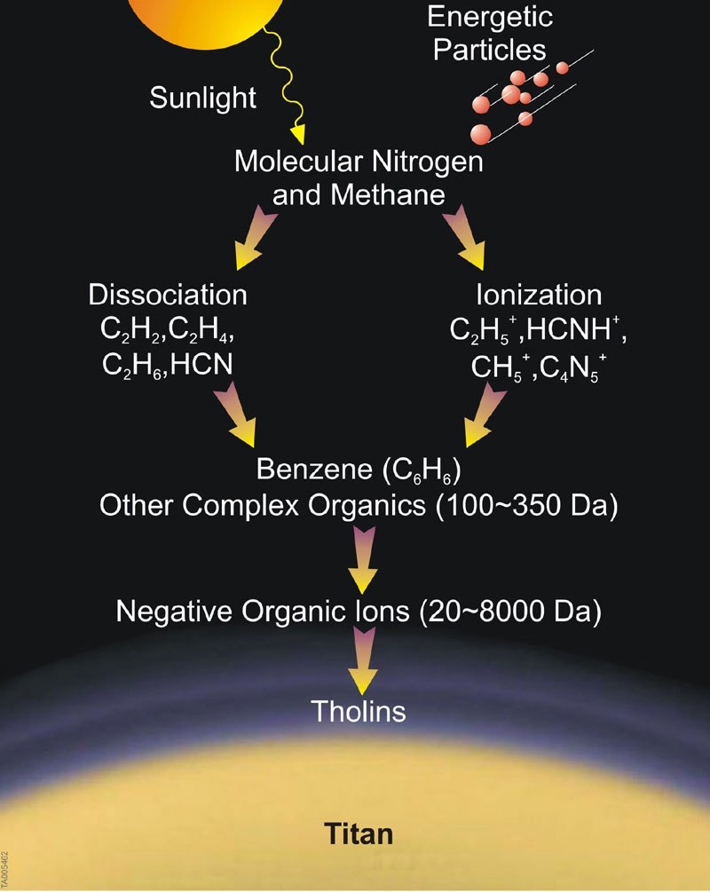 ''카시니-호이겐스''는 타이탄 대기의 동위원소 농도를 통해 대기 중 질소가 초기 토성을 형성한 물질이 아닌, 혜성과 관련된 오르트 구름의 물질에서 기원했음을 보여주었다.[13] 또한 타이탄에서는 다환 방향족 탄화수소,[15][4] 프로필렌,[16] 메탄[17][18] 등 복잡한 유기 화합물이 생성될 수 있음이 밝혀졌다.[14]
