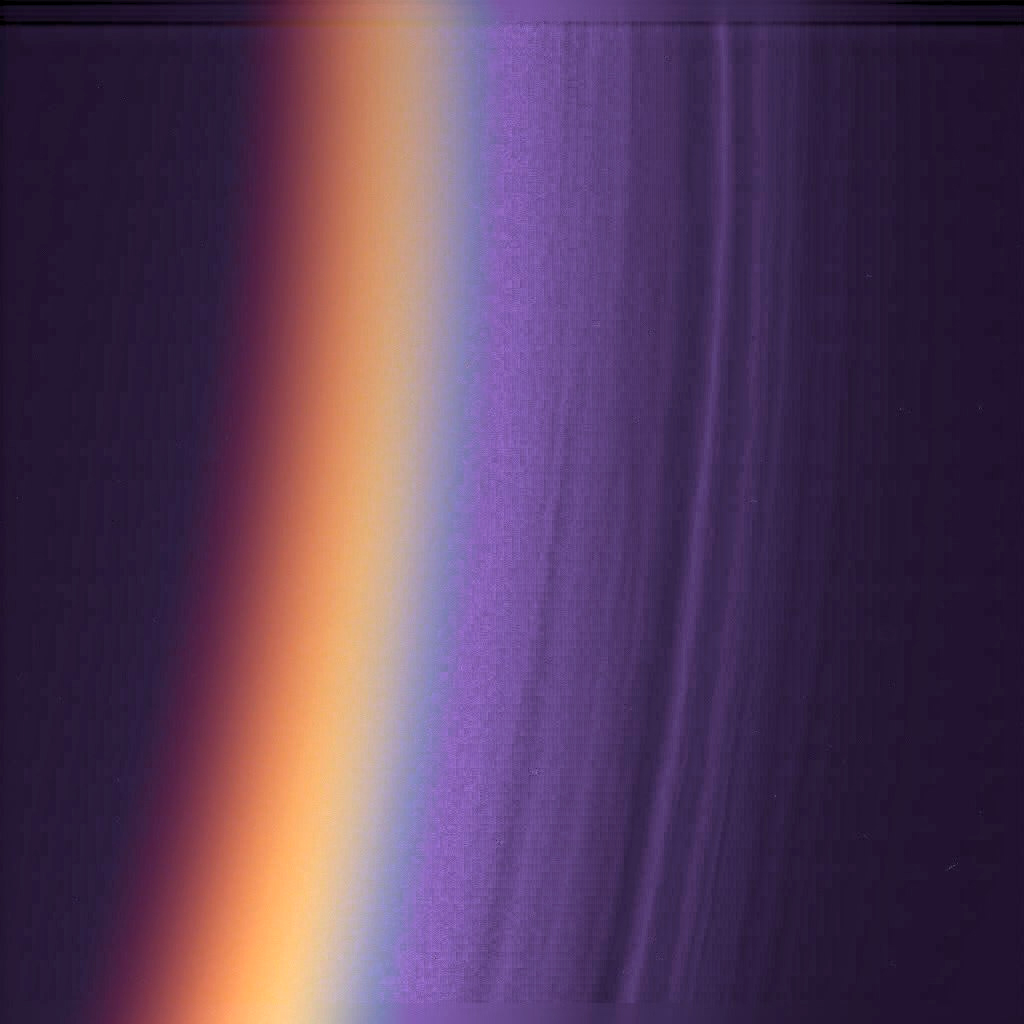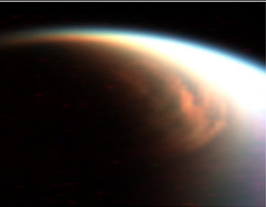 우주에서, ''카시니'' 이미지는 근적외선에서 UV 파장에 이르기까지 황혼 기간(위상각 > 150°)이 타이탄의 낮보다 ''더 밝다''는 것을 보여주었다.[60] 이러한 관측은 두꺼운 대기를 가진 다른 행성체에서는 관측되지 않았다.[60] 타이탄 황혼이 낮 측면보다 더 밝은 것은 타이탄의 대기가 표면 위 수백 킬로미터까지 확장되고 헤이즈에서 강렬한 전방 미 산란이 결합된 결과이다.[60]