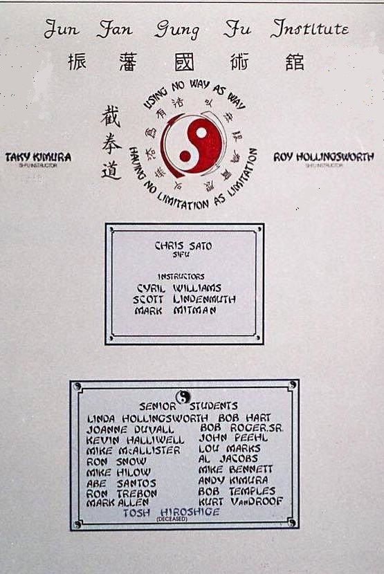 타키 키무라는 1924년 미국 워싱턴주에서 태어난 인물로, 제2차 세계 대전 중 일본계 미국인 수용소에 수감되었다. 그는 수용소에서 유도를 배우고, 이후 브루스 리의 초기 제자이자 조수, 절친한 친구가 되었다. 키무라는 브루스 리가 직접 인정한 세 명의 무술 제자 중 한 명이었으며, 리의 장례식에서 운구자 중 한 명이었다. 진번 쿵후 7단의 키무라는 준 판 쿵푸 사범을 배출했으며, 2009년에는 85세의 나이로 고등학교 졸업장을 받았다. 그는 96세의 나이로 사망했다.