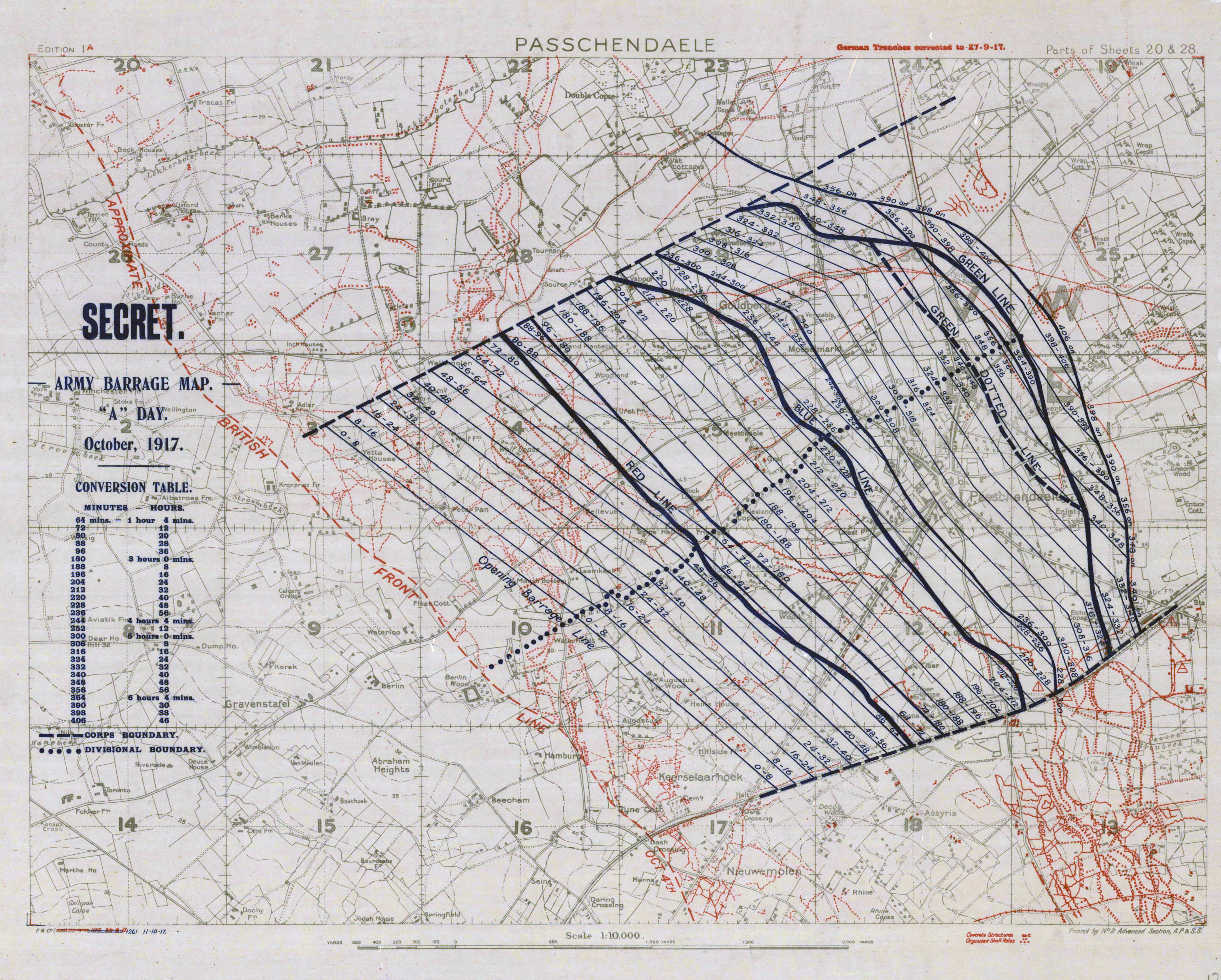 초기 영국의 탄막 사격은 주로 파편탄으로 구성되었으나, 곧 고폭탄이 거의 동등한 비율로 혼합되었고, 나중에는 연막탄도 추가되었다. 탄막의 전진 속도는 지형과 상황에 따라 1분에서 6분마다 약 91.44m씩 이동하도록 계획되었으나, 6분은 너무 느린 것으로 판명되었다.[24] 1917년 아라스 전투에서는 탄막 사격이 매우 복잡하고 거대해져서, 보병 전방 약 1828.80m 깊이에 걸쳐 5~6개의 포격선이 형성되기도 했다. 후방 차단 탄막, 방향 전환 탄막, 기관총 탄막 등 다양한 형태가 등장했으며, 적을 속이거나 위치를 노출시키기 위한 기만적인 허위 탄막도 사용되었다.[25] 파스샹달 전투 개시 공격에서는 3,000문 이상의 영국군 포와 곡사포가 동원된 대규모 탄막 사격이 이루어졌다. 전선 약 13.72m당 1문의 18파운더포, 약 45.72m당 1문의 중곡사포가 배치되었고, 프랑스군 지역에도 추가 포가 배치되었다. 영국군 탄막은 4분마다 약 91.44m씩 전진했으며, 보병은 폭발 지점에서 약 45.72m 이내로 근접하여 따라갔다. 목표 지점에 도달하면 탄막은 그 너머 약 457.20m 지점에 머무르며 독일군의 예상 반격을 저지하기 위해 앞뒤로 움직였고, 일부 포병은 다음 단계의 진격을 지원하기 위해 전진 배치되었다.[27]