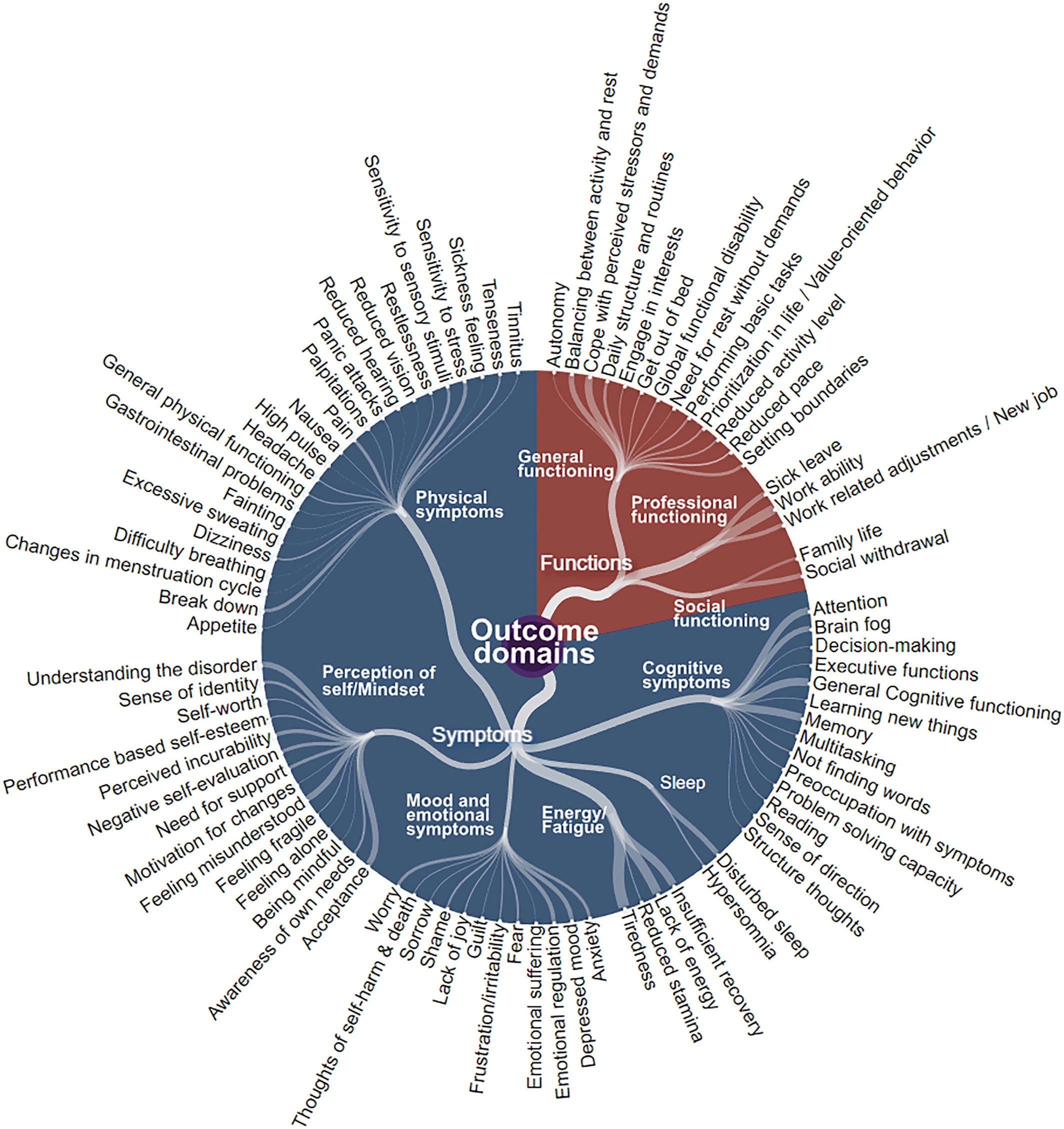 엘린 린드세터(Elin Lindsäter) 등의 2023년 연구에서는 피로(48%), 에너지 부족(41%), 과도한 활동 후 회복의 어려움(33%), 전반적인 인지 기능 저하(33%), 기억 문제(32%), 인지된 스트레스와 요구에 대처하는 어려움(31%) 등이 탈진 증후군을 겪는 사람들이 가장 많이 보고하는 증상으로 나타났다.[161]