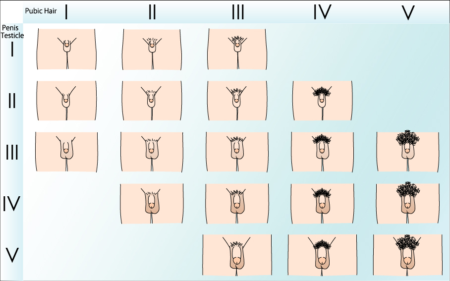 발육 중인 남성 생식기. 음경과 고환의 단계와 음모의 단계가 일치하지 않는 경우도 많다
