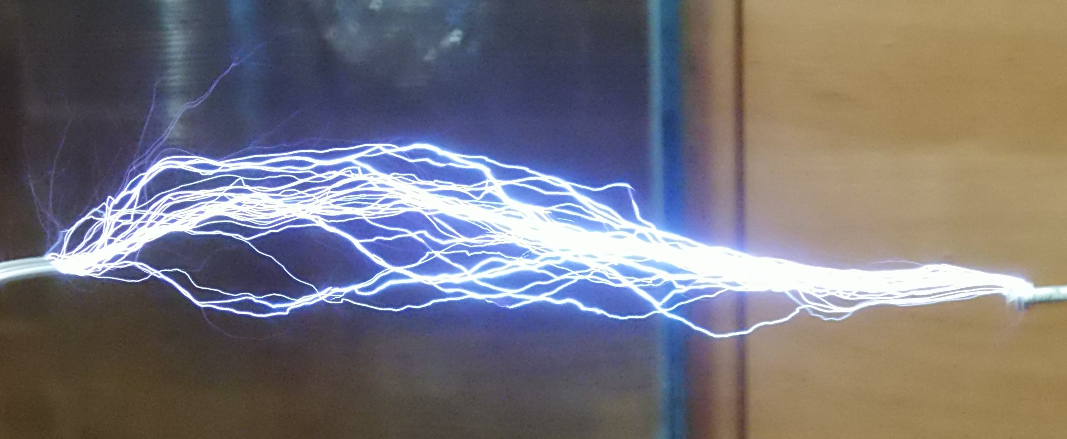 이 과정에서 2차 코일에는 여러 개의 정재파가 형성될 수 있으며, 1차 코일과 2차 코일 사이의 자계 위상 결합 현상이 전력 전달 효율과 전압 증폭에 중요한 역할을 한다.[77] 높은 전압은 주변 공기를 이온화시켜 화려한 코로나 방전, 브러시 방전, 스트리머 방전 아크를 발생시킨다. 테슬라 코일의 작동 원리는 진행파 이론과 공진 변압기 이론 모두로 설명될 수 있으며, 2차 코일의 분포 정수 특성까지 고려하여 분석하기 어려운 경우, 이를 집중 정수 회로로 취급해도 거의 유사한 결과를 얻을 수 있다.[82]