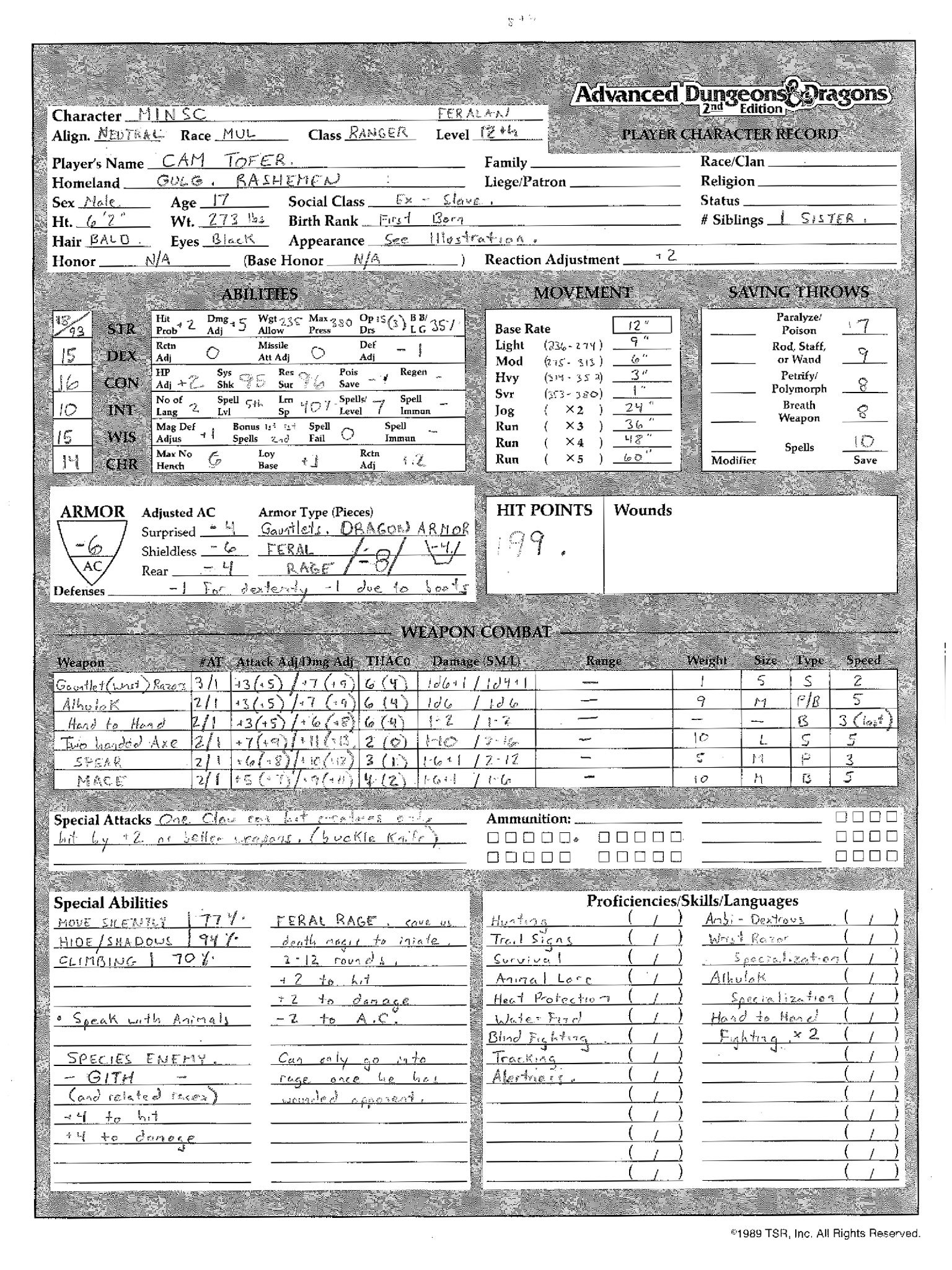 ::: 플레이어 캐릭터의 데이터를 기록하는 전용 용지. 기본 룰북에 포함되며, 일반적으로 데이터 기록 부분은 백지이지만, 시스템에 따라 미리 데이터가 어느 정도 기입된 "샘플 캐릭터"가 준비되어 있는 경우도 있다.