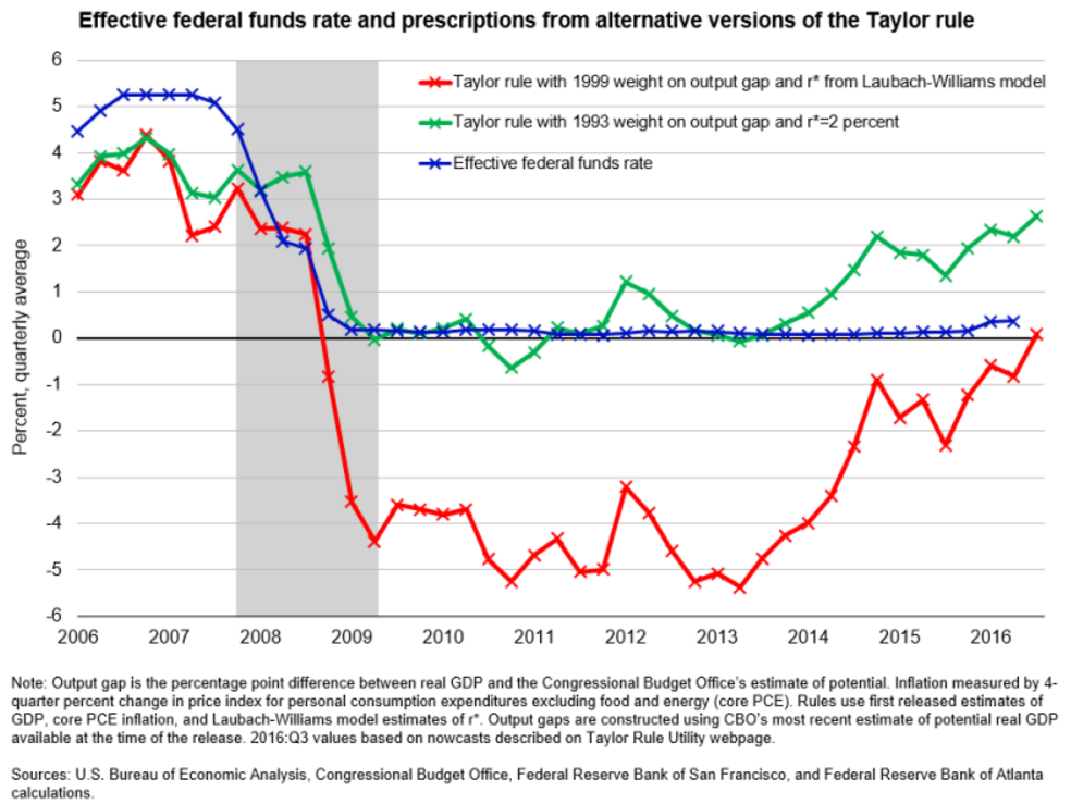 2000년대 이후 선진국, 특히 미국의 실제 금리는 테일러 준칙이 제시한 금리보다 낮았다. 이러한 차이는 중앙은행이 금융 위기의 결과를 완화해야 했고, 인플레이션 기대치가 주어진 경우에만 개입해야 했기 때문에 설명될 수 있다. 경제적 충격은 더 낮은 금리를 동반했다.[8]