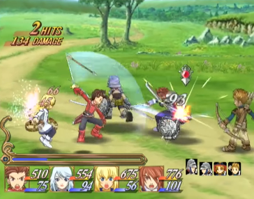 전투 중 적에게 피해를 주면 화면 상단의 "유니즌 게이지"가 채워진다. 이 게이지가 가득 찼을 때 특정 버튼(GC판 Z 버튼, PS2판 오른쪽 스틱)을 누르면 '''유니즌 어택'''을 발동할 수 있다.[12] 유니즌 어택은 파티원 전원이 동시에 기술을 사용하여 특정 적에게 집중 공격을 가하는 시스템이다. 첫 공격이 명중해야 연계가 가능하며, 빗나가면 게이지가 크게 줄어든다. 특정 기술들을 조합하여 유니즌 어택을 사용하면, 더욱 강력한 '''복합 특기'''가 발동되기도 한다. 예를 들어, 레이와 상급 마법을 조합하면 "프리즘 믹스 스타즈", 피코 망치와 호아파참을 조합하면 "피코파참" 등이 나간다. 여러 복합 특기 조건이 동시에 만족될 경우, 정해진 우선순위에 따라 가장 높은 순위의 기술이 발동된다.