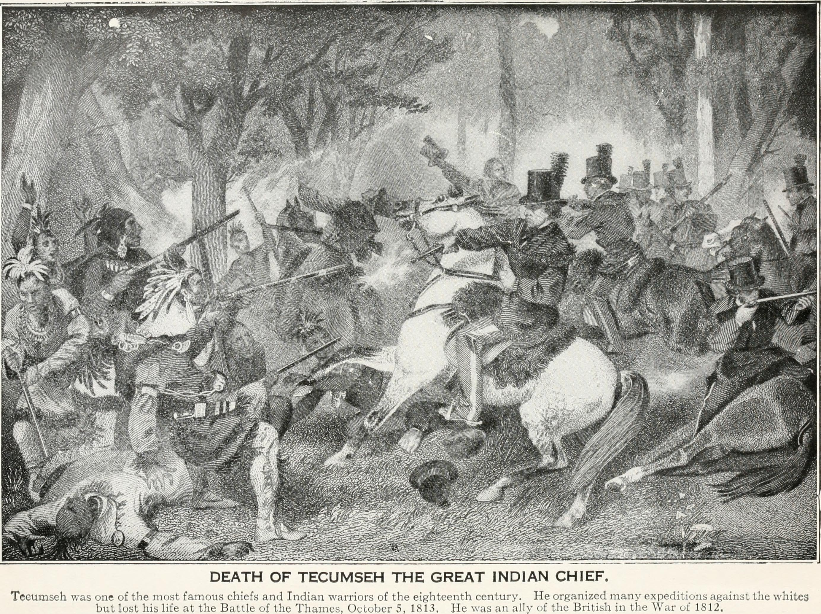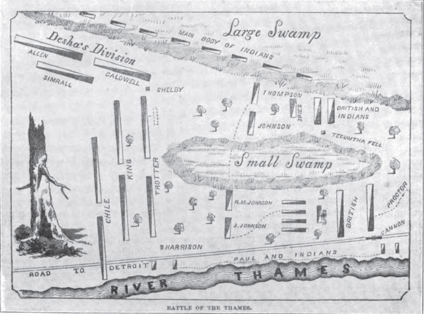 주력군은 늪을 통과했고, 제임스 존슨의 부대는 영국군에 대한 공격으로부터 풀려났다. 테쿰세의 죽음에 대한 소식이 퍼지면서 미국 증원군이 집결했고, 인디언의 저항은 붕괴되었다. 존슨이 테쿰세를 사살한 것으로 알려졌지만,[16] 증거는 불분명하다. 윌리엄 휘틀리도 그를 죽인 것으로 여겨진다. 변호사이자 한 팔 사격수인 제임스 A. 드레인 시니어는 자서전 ''한 손으로'' (1927)에서 휘틀리의 손녀로부터 휘틀리와 테쿰세가 동시에 서로를 죽였다는 가족 전승을 들었다고 썼다.