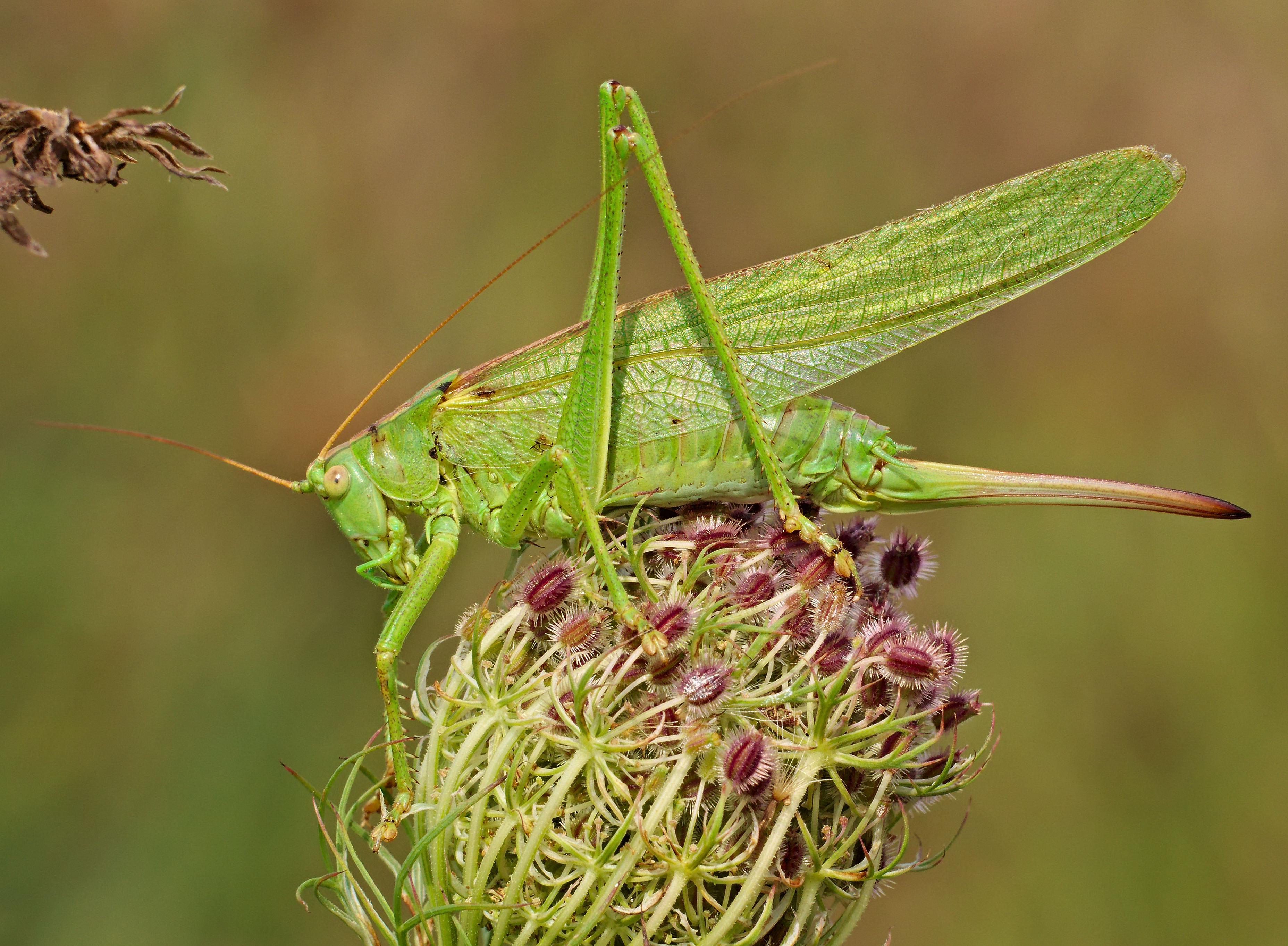 ''Tettigonia viridissima''는 매우 길고 가느다란 촉수를 가지고 있으며, 촉수는 몸 길이의 최대 세 배까지 뻗을 수 있다. 항상 짧은 촉수를 가진 메뚜기와는 구별된다. 날개가 산란관보다 1cm 짧은 ''Tettigonia cantans'' 또는 뒷다리 넙다리에 눈에 띄는 검은 가시가 있는 ''Tettigonia caudata''와 혼동될 수 있다.