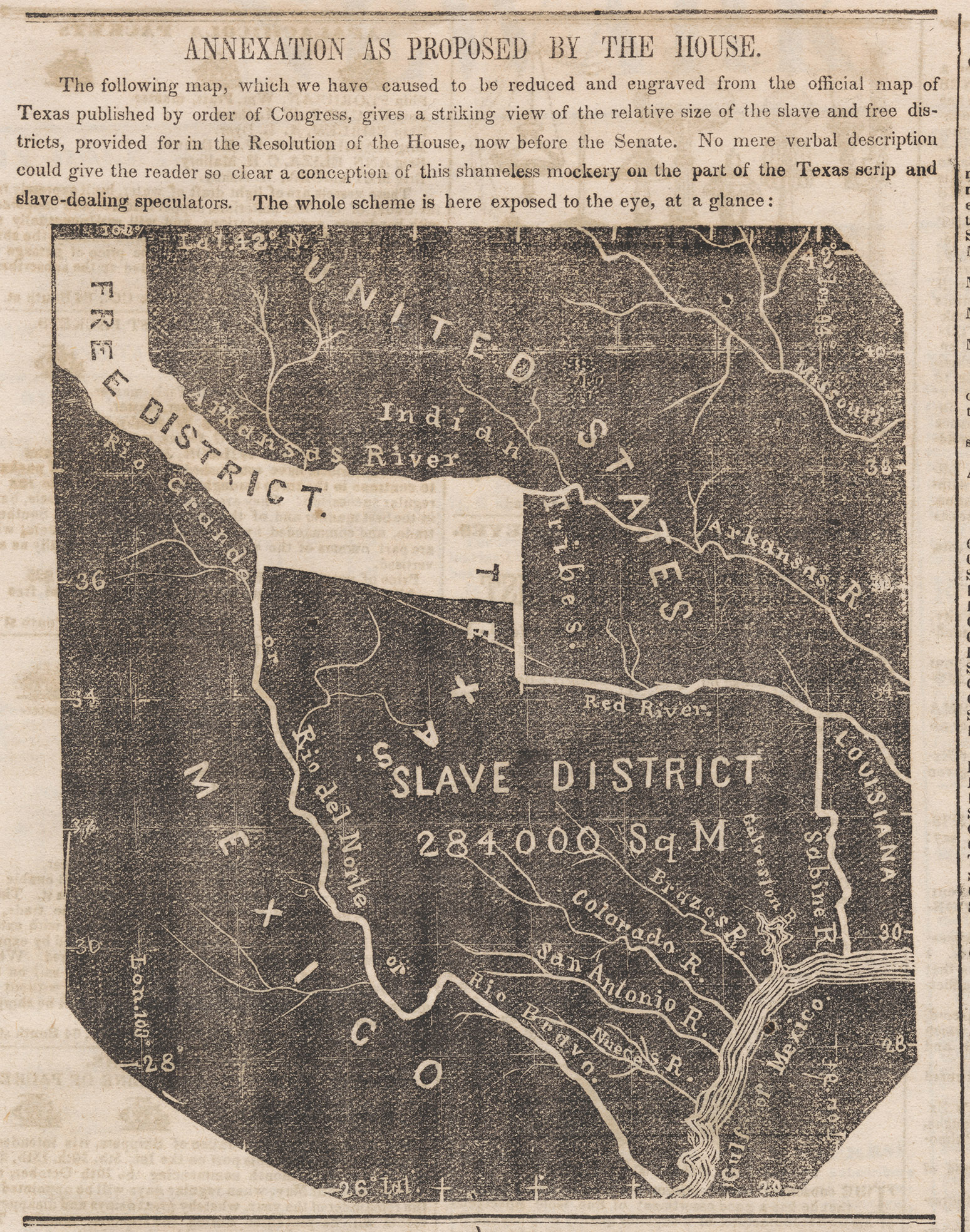 1819년부터 1821년까지 이어진 미주리 타협은 루이지애나 매입 지역 내 북위 36도 30분선을 기준으로 자유주와 노예주를 나누는 제시 B. 토머스 조항을 포함하면서, 남부 노예 소유주들의 팽창주의적 열망을 더욱 강화했다.[9] 비록 남부 의원 다수가 루이지애나 매입 지역 대부분에서 노예제를 배제하는 데 동의했지만, 상당수 소수는 이에 반대했다.[10][11] 버지니아 주 신문 편집자 토머스 리치는 《리치몬드 인콰이어러》에서 이러한 제한 때문에 남부가 결국 텍사스를 필요로 할 것이라고 주장하며 "만약 우리가 북쪽에 갇힌다면, 우리는 서쪽으로 팔꿈치를 뻗을 여유가 있어야 한다"고 예측했다.[12][13] 1824년 버지니아주 하원의원 존 B. 플로이드는 국무장관 애덤스가 1819년 북부의 노예 반대론자들의 이익을 위해 텍사스를 스페인에 넘겨주어 남부가 추가적인 노예주를 확보하지 못하게 했다고 비난했다.[14] 당시 버지니아주 하원의원이었던 존 타일러는 노예제를 둘러싼 지역 갈등에 맞서 제퍼슨주의의 영토 및 상업 확장 원칙을 국가 목표로 내세웠다. 그의 "확산(diffusion)" 이론은 미주리가 노예주로 편입됨에 따라, 활용도가 낮은 노예들을 서부의 새로운 주로 이동시켜 동부 주의 노예 수를 줄이고, 결과적으로 구 남부에서 노예 해방을 가능하게 할 것이라고 주장했다.[15] 이 이론은 훗날 텍사스 합병 논쟁 과정에서 다시 등장하게 된다.[16][17]