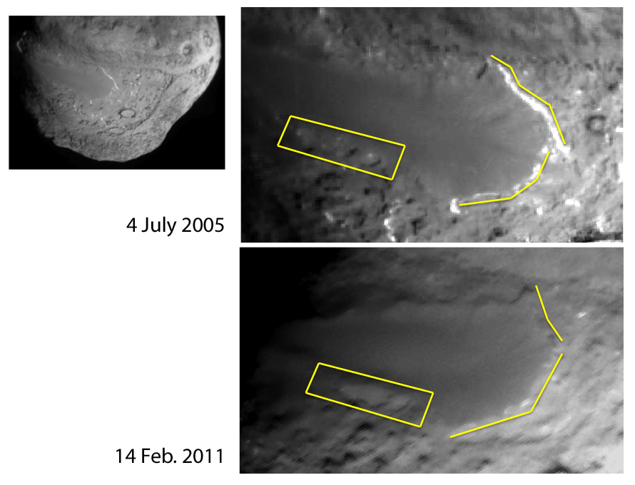 템펠 1 혜성의 변화. 딥 임팩트(위)와 스타더스트(아래)의 사진을 비교하면, 혜성이 태양 주위를 한 바퀴 공전하는 동안 휘발성 물질이 기화되면서 움푹 들어간 곳이 여러 개 있던 장소가 합쳐져 큰 움푹 들어간 곳이 된 것을 알 수 있다.