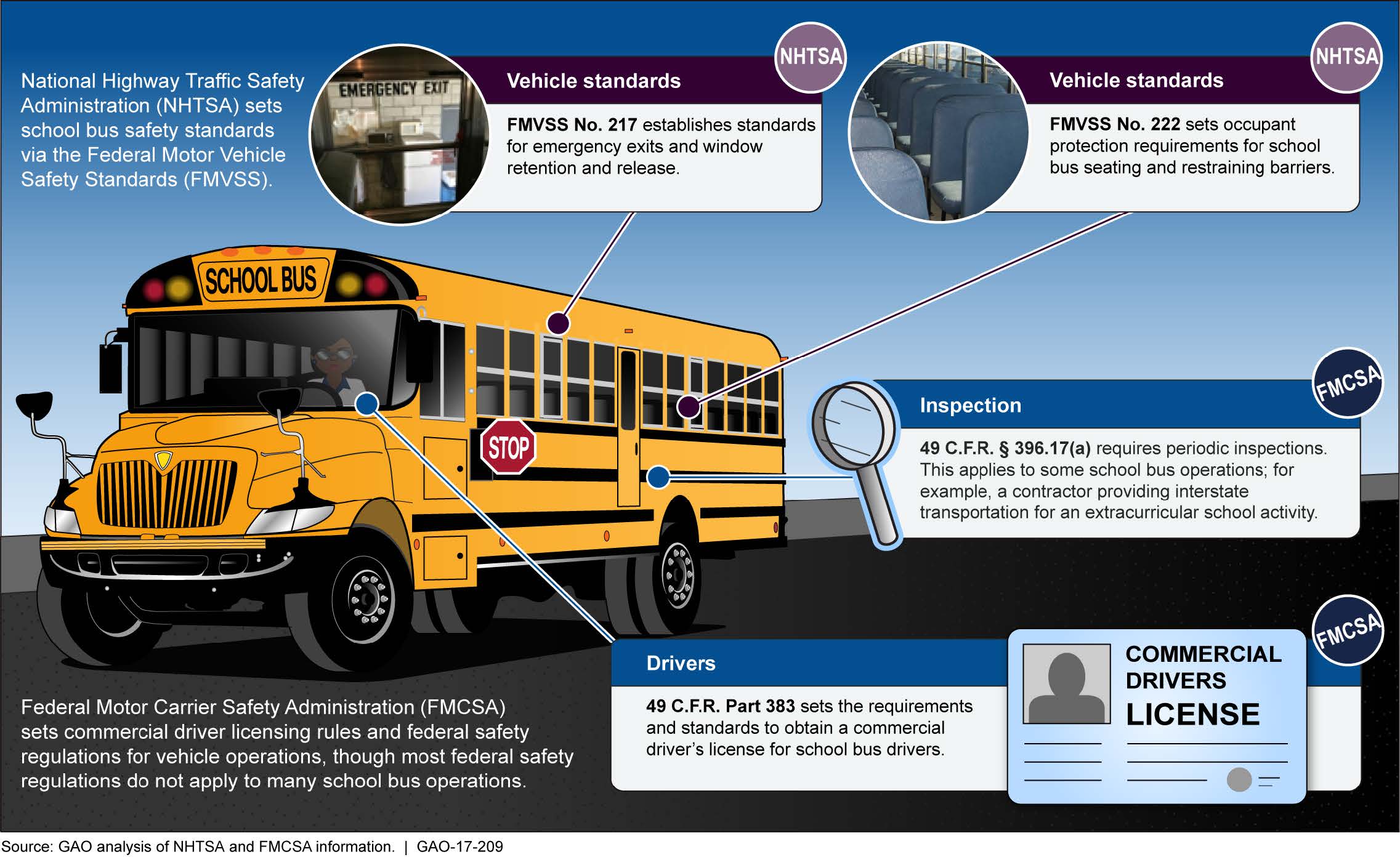 미국 고속도로교통안전국(NHTSA)과 미국 교통안전위원회(NTSB)에 따르면, 스쿨 버스는 도로 차량 중 가장 안전한 유형이다.[25] 2013년에서 2022년 사이에 976건의 스쿨 버스 관련 사망 사고가 발생하여 1,082명이 사망하고 약 132,000명이 부상을 입었다.[26] 평균적으로 매년 5명의 스쿨 버스 탑승 학생이 사망하며, 통계적으로 스쿨 버스는 자가용으로 등교하는 것보다 70배 이상 안전하다.[27] 스쿨 버스 관련 사망 사고의 대부분은 다른 차량의 탑승자 및 보행자와 관련이 있으며 (버스 탑승자는 5%에 불과하다).[28]1939년 일관된 스쿨 버스 표준이 처음 개발된 이후, 지난 80년 동안 스쿨 버스에 대한 많은 변화는 안전과 관련이 있었으며, 특히 주 및 연방 정부에서 채택한 더욱 엄격한 규정에 대한 대응으로 이루어졌다.