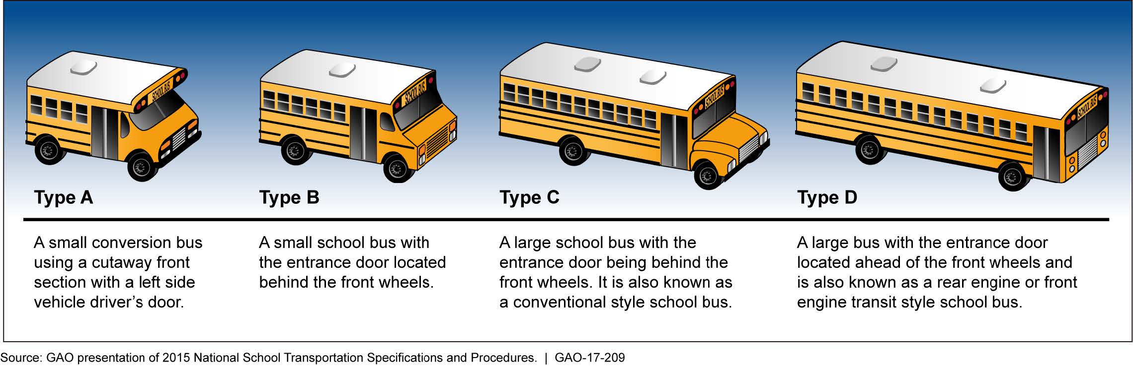 북미 지역의 제조사에서 생산하는 통학 버스는 4가지 유형이 있다.[1] A형(숏 버스)은 가장 작은 통학 버스이고, B형은 노출된 프론트 엔진 섀시에 차체를 얹은 형태이다. C형은 카울형 중형 트럭 섀시에 차체를 얹은 형태이며, D형은 노출된 "포워드 컨트롤" 또는 "푸셔" 섀시에 차체를 얹은 대형 통학 버스이다. C형 버스는 가장 일반적인 디자인이며, D형 버스는 가장 큰 차량이다.