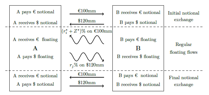 기본 원리 | 두 당사자가 서로 다른 통화로 표시된 원금을 교환 계약 기간 동안 이자를 교환 계약 만기 시 원금을 재교환 |