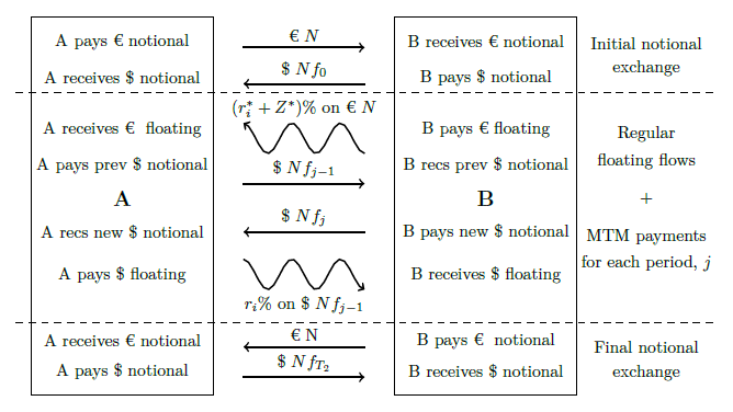 은행 간 시장에서 거래되는 가장 일반적인 통화 스와프(XCS)는 시장가격 평가(MTM) XCS이다. 이는 환율 변동에 따라 스왑 기간 동안 정기적으로 명목 교환이 이루어지는 방식이다. MTM 가치가 중립적인 상태를 유지하고 스왑 기간 동안 큰 자산이나 부채(환율 변동으로 인해)가 되지 않도록 하기 위해 수행된다.[1]이보다 덜 일반적이지만 정의하기 더 간단한 비MTM XCS에는 통화의 선지급 명목 교환과 XCS 만기 시 동일한 명목 통화의 재교환이 포함된다.[1]