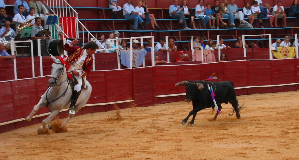 - '''스페인식 투우''' (코리다)는 투우사(마타도르)가 소와 싸우는 가장 잘 알려진 형태이다. 스페인에서는 투우가 국기로 여겨질 정도로 성행하고 있다.[168][169] 스페인 투우는 "코리다(Corrida de toros)"라고 불리는데, "소의 질주"를 의미하며, "la corrida"만으로도 투우를 가리킨다. 무레타라는 붉은 천이 사용되는데, 소는 색깔을 구분하지 못하고 움직임에 흥분한다.