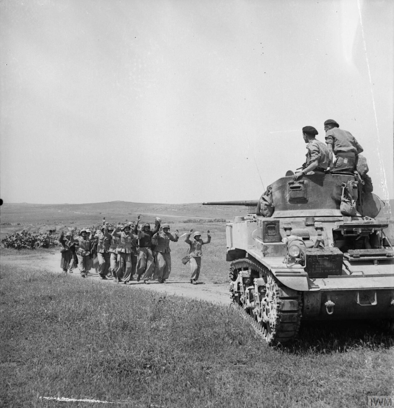 1943년 5월 6일, 프렌지 근처에서 영국 스튜어트 전차에 항복하는 독일군.