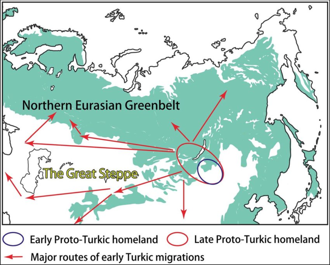 기원전 2,200년경, 튀르크 민족의 조상은 서쪽으로 몽골로 이주하여 유목 생활 방식을 채택했으며, 이는 이란 민족에게서 부분적으로 차용한 것이다.[380] 흉노, 유연, 선비족과 같은 유목 민족이 동북아시아 유전자 풀을 공유한다는 점을 고려할 때, 튀르크조어 사용자들은 동북아시아에서 기원했을 가능성이 높다.[380]