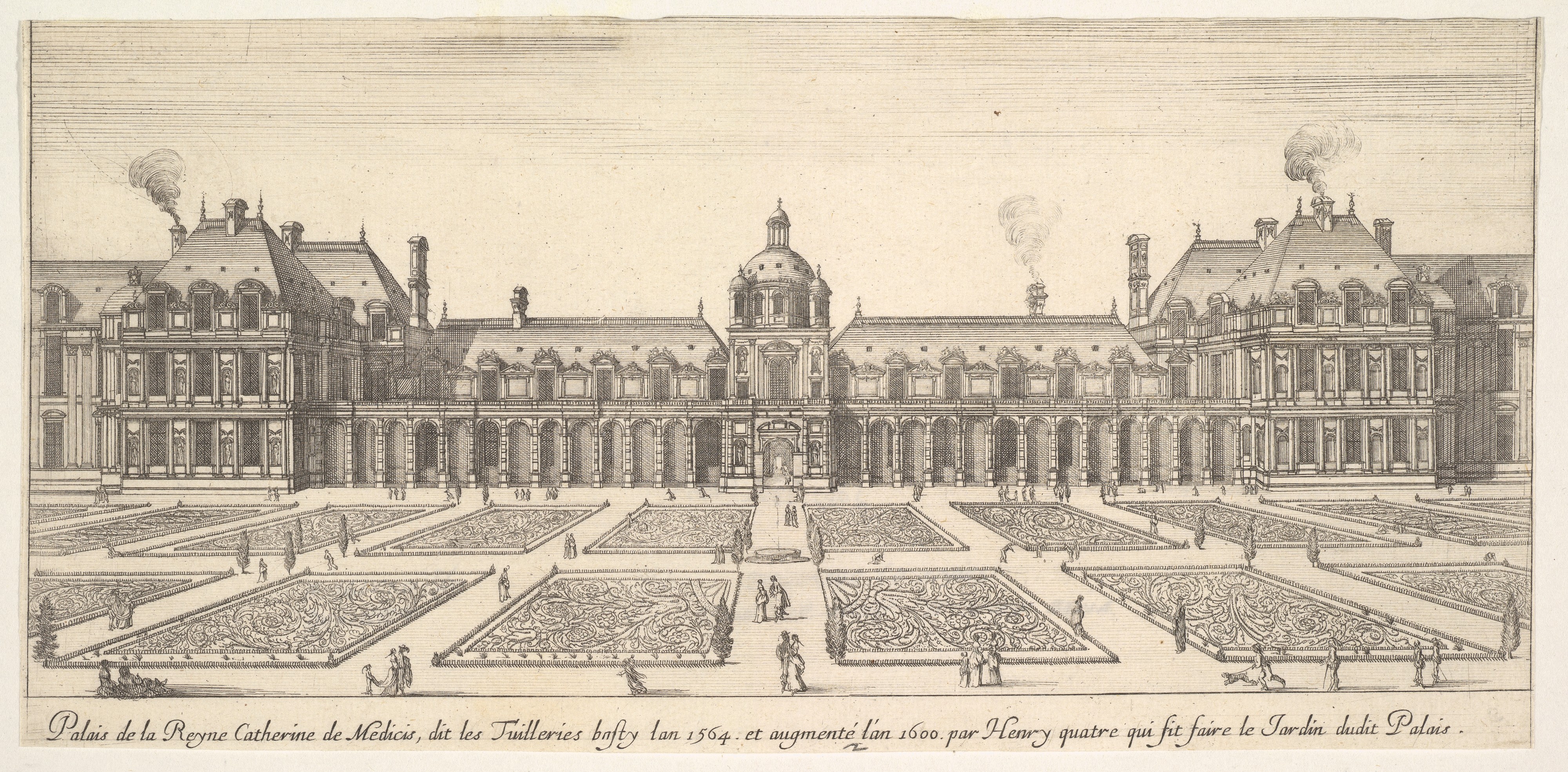 1563년 카트린 드 메디치의 명으로 필리베르 드 로름의 설계 하에 튀일리 궁전 건조가 시작되어 약 100년에 걸쳐 완성되었다.[24] 1664년 루이 14세의 명으로 앙드레 르 노트르가 정원을 조성했지만, 1683년 왕궁이 베르사유 궁전으로 옮겨지면서 튀일리 궁전은 비게 되었다. 루이 15세는 즉위 초 잠시 튀일리 궁전에 머물렀지만, 1722년 다시 베르사유로 돌아갔고, 이후 궁전은 예술가들의 사교장으로 활용되었다.
