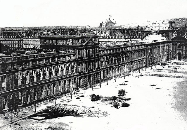 1871년 5월 23일 파리 코뮌 진압 중에 코뮌 측 병사들이 튀일리 궁전 인근에 불을 질렀다. 석유와 액체 타르 등을 사용해 방화했고, 화재는 48시간 동안 지속되어 궁전 전체가 소실되었다.[24] 루브르 궁전의 외곽 건물도 상당 부분 피해를 입었으나, 루브르 박물관은 거의 완벽한 상태로 남았다.