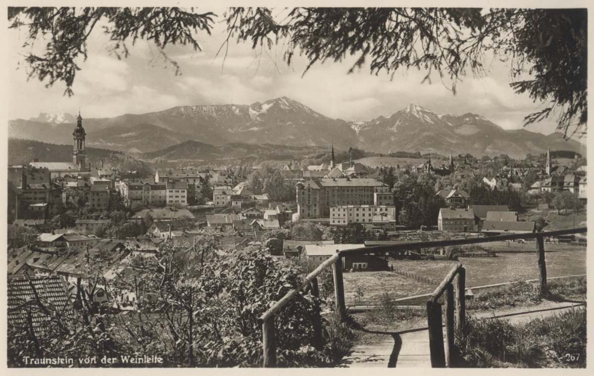 1930년의 트라운슈타인. 북쪽에서 바라본 마을의 모습. 배경에는 호흐펠른 산과 호흐게른 산이 보인다.