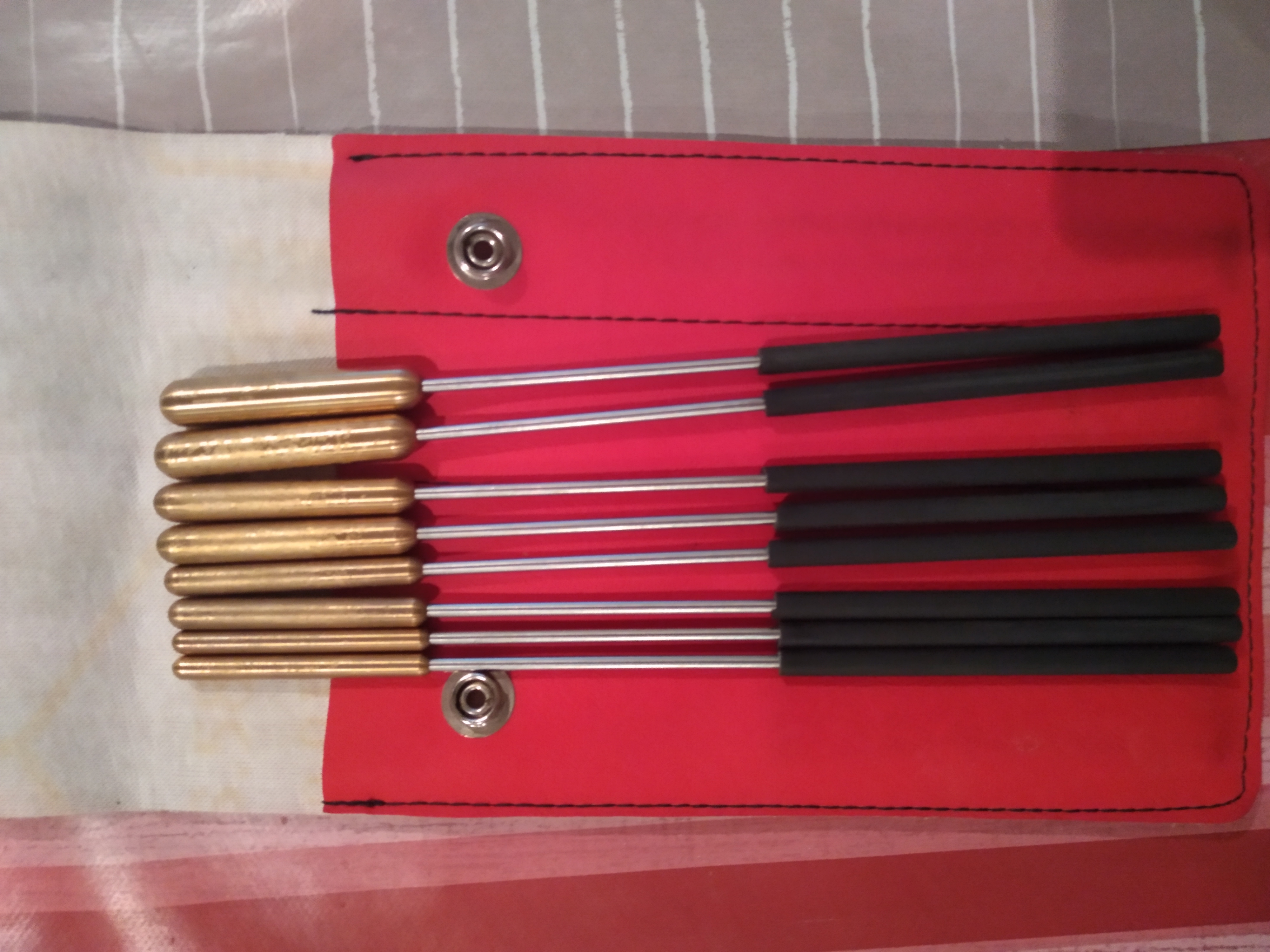 곡의 분위기나 요구되는 음량 등에 따라 크기(변의 길이와 막대 직경)가 다른 악기, 또는 제조사를 바꿔 사용한다. 매우 작은 소리를 낼 때는 보통보다 가벼운 비터를 사용하며, 곡의 분위기나 요구되는 음량 등에 따라 비터를 바꿔 사용하기도 한다. 뜨개질 바늘, 기타 나무 비터를 작곡가가 요구하는 경우도 있다.